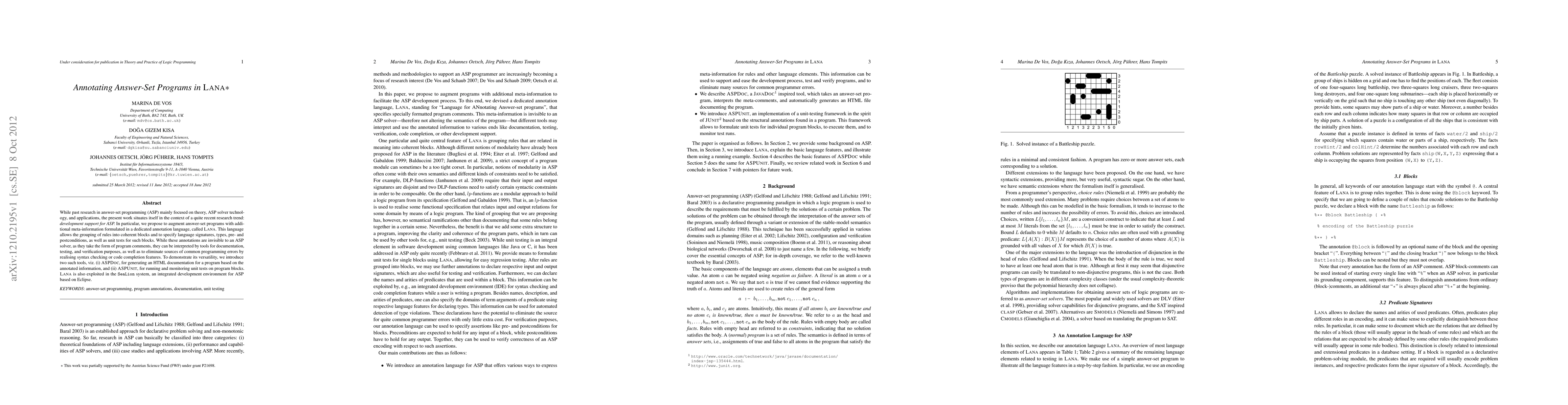 This paper proposes LANA, an annotation language for answer-set programs, enabling grouping of rules, specifying signatures and conditions, and unit testing. Tools ASPDOC and ASPUNIT are introduced for documentation and testing based on these annotations, aiding in development support for ASP, with SeaLion system also utilizing LANA for an integrated development environment.