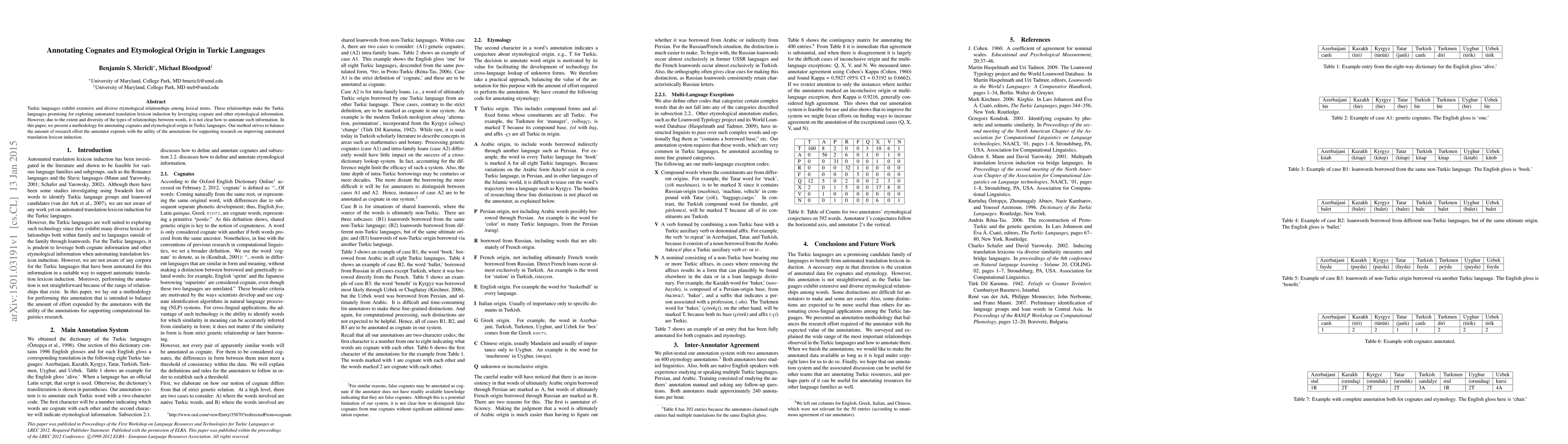 The paper presents a methodology for annotating cognates and etymological origin in Turkic languages, balancing research effort with annotation utility for automated translation lexicon induction.