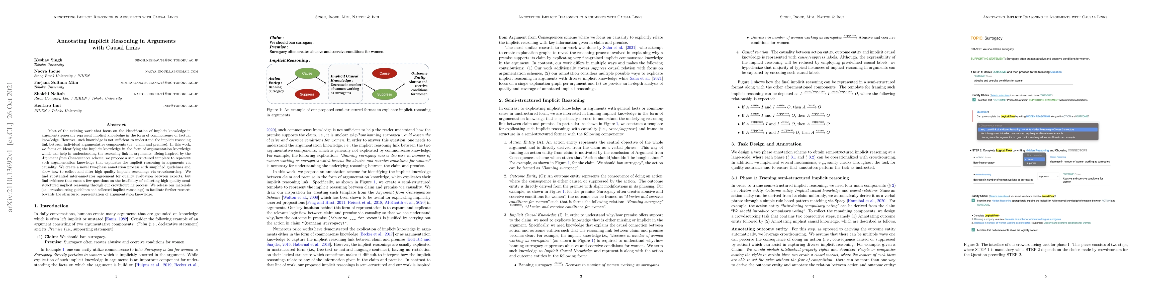 This paper proposes a semi-structured template to represent implicit reasoning in arguments through causal links, using a two-phase annotation process. While it achieves high inter-annotator agreement, it raises questions about the feasibility of collecting high-quality data via crowdsourcing.