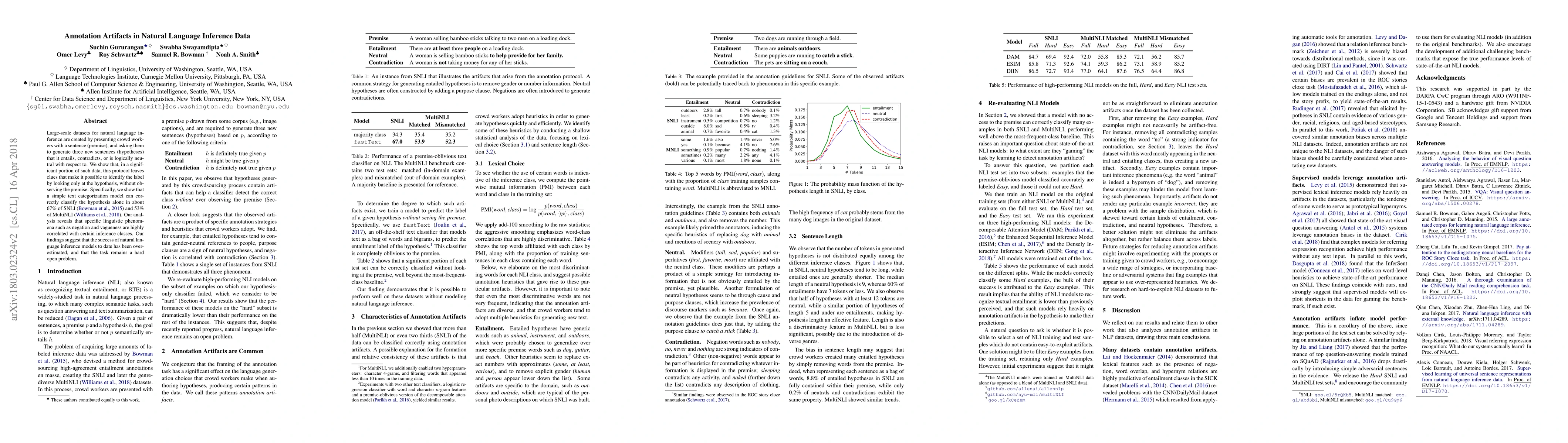 This paper reveals that annotation artifacts in large-scale natural language inference datasets, such as SNLI and MultiNLI, allow hypotheses to be classified without the premise, indicating overestimation of model success. Specific linguistic features like negation and vagueness correlate with inference classes, highlighting the task's ongoing challenges.