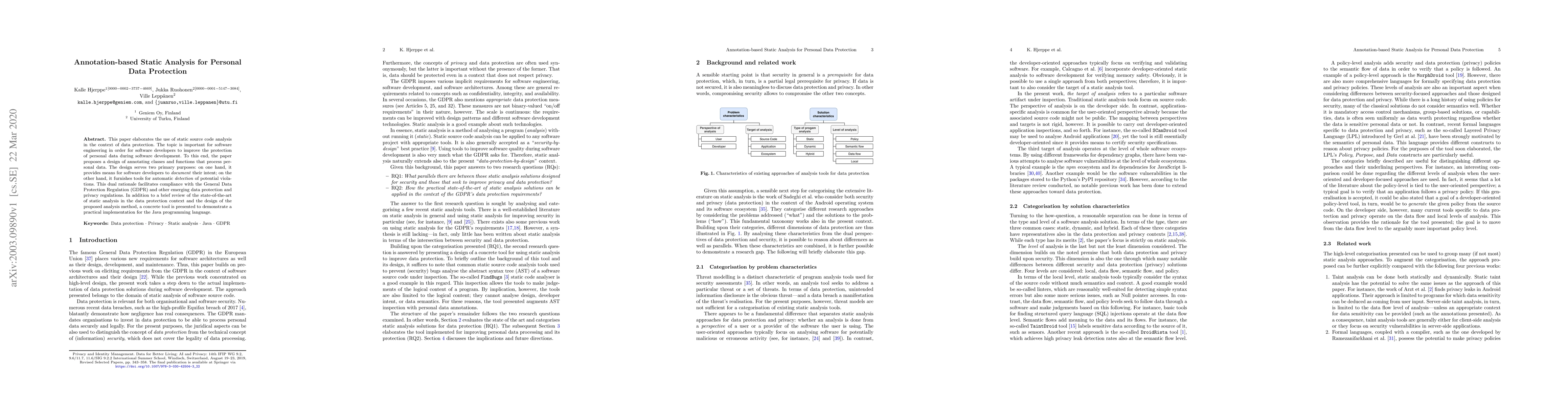 This paper elaborates the use of static source code analysis in the context of data protection. The topic is important for software engineering in order for software developers to improve the protection of personal data during software development. To this end, the paper proposes a design of annotating classes and functions that process personal data. The design serves two primary purposes: on one hand, it provides means for software developers to document their intent; on the other hand, it furnishes tools for automatic detection of potential violations. This dual rationale facilitates compliance with the General Data Protection Regulation (GDPR) and other emerging data protection and privacy regulations. In addition to a brief review of the state-of-the-art of static analysis in the data protection context and the design of the proposed analysis method, a concrete tool is presented to demonstrate a practical implementation for the Java programming language.