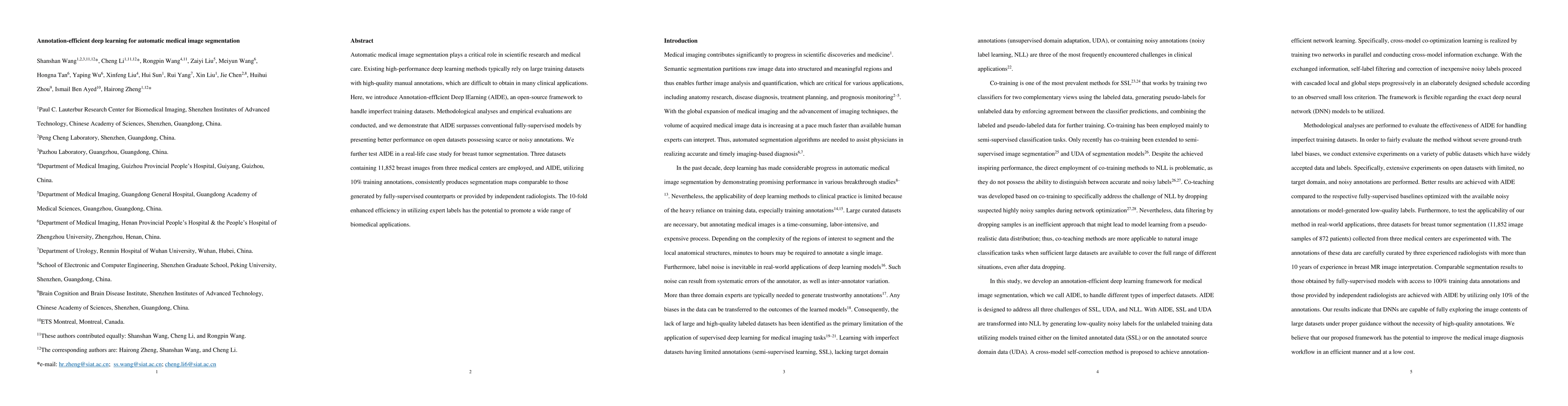The paper introduces AIDE, an annotation-efficient deep learning framework that performs well with limited and imperfect annotations, outperforming fully-supervised models on medical image segmentation tasks. AIDE's efficacy is demonstrated through its application to breast tumor segmentation across three medical centers, showing comparable results using only 10% of the required annotations.
