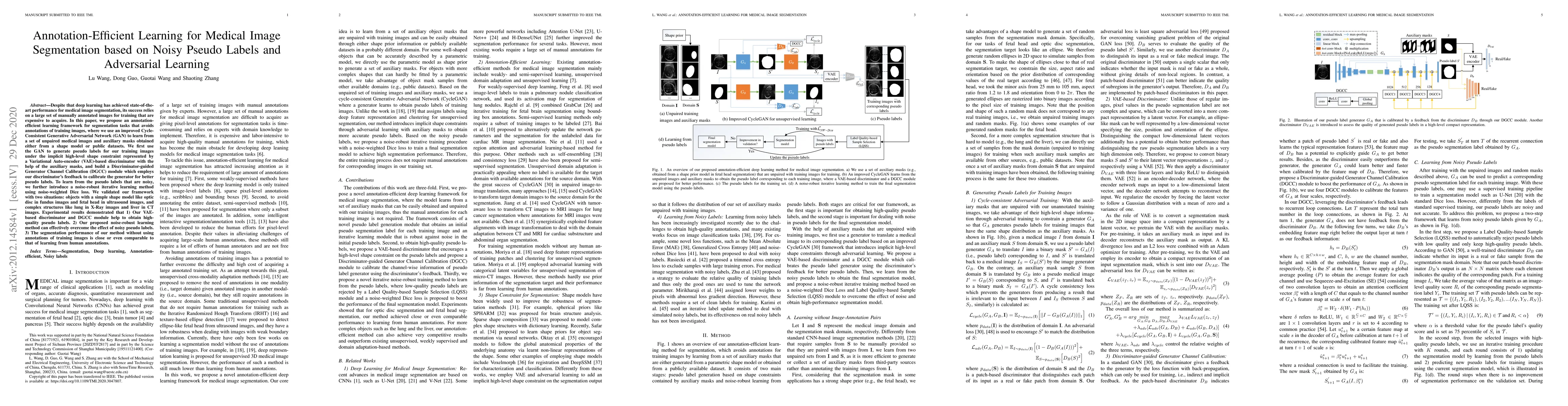 This paper introduces an annotation-efficient learning framework for medical image segmentation that leverages noisy pseudo labels and adversarial learning to avoid costly manual annotations. The proposed framework uses an improved Cycle-Consistent GAN with a VAE-based discriminator and a DGCC module to generate and calibrate pseudo labels, followed by a noise-robust iterative learning method to enhance segmentation performance. Experimental results show that the method achieves comparable segmentation accuracy to fully annotated training.