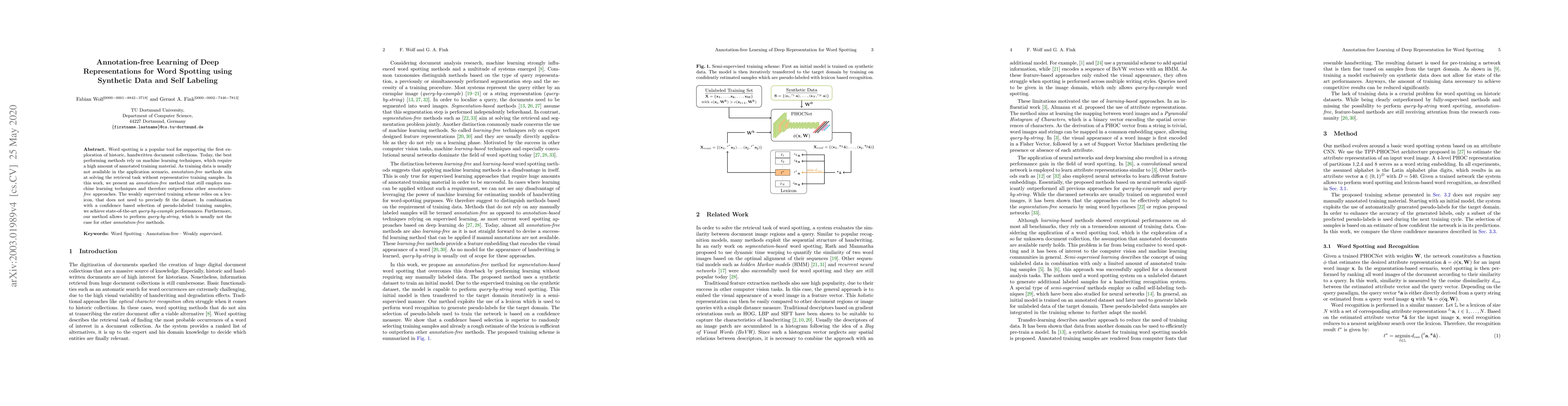 This paper presents an annotation-free method for word spotting using synthetic data and self-labeling, achieving state-of-the-art query-by-example performances without requiring annotated training samples.