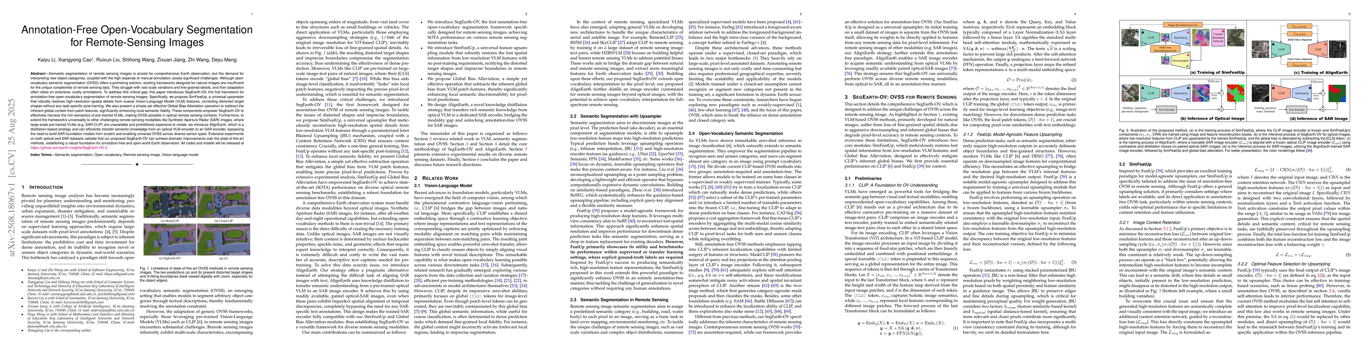 Semantic segmentation of remote sensing (RS) images is pivotal for comprehensive Earth observation, but the demand for interpreting new object categories, coupled with the high expense of manual annotation, poses significant challenges. Although open-vocabulary semantic segmentation (OVSS) offers a promising solution, existing frameworks designed for natural images are insufficient for the unique complexities of RS data. They struggle with vast scale variations and fine-grained details, and their adaptation often relies on extensive, costly annotations. To address this critical gap, this paper introduces SegEarth-OV, the first framework for annotation-free open-vocabulary segmentation of RS images. Specifically, we propose SimFeatUp, a universal upsampler that robustly restores high-resolution spatial details from coarse features, correcting distorted target shapes without any task-specific post-training. We also present a simple yet effective Global Bias Alleviation operation to subtract the inherent global context from patch features, significantly enhancing local semantic fidelity. These components empower SegEarth-OV to effectively harness the rich semantics of pre-trained VLMs, making OVSS possible in optical RS contexts. Furthermore, to extend the framework's universality to other challenging RS modalities like SAR images, where large-scale VLMs are unavailable and expensive to create, we introduce AlignEarth, which is a distillation-based strategy and can efficiently transfer semantic knowledge from an optical VLM encoder to an SAR encoder, bypassing the need to build SAR foundation models from scratch and enabling universal OVSS across diverse sensor types. Extensive experiments on both optical and SAR datasets validate that SegEarth-OV can achieve dramatic improvements over the SOTA methods, establishing a robust foundation for annotation-free and open-world Earth observation.