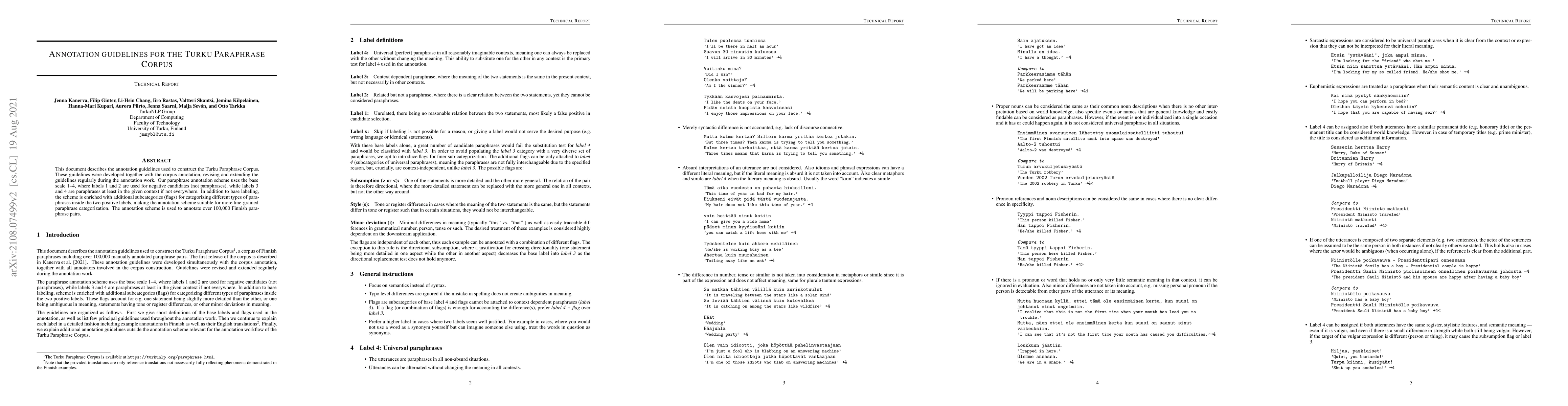 This paper outlines the annotation guidelines for the Turku Paraphrase Corpus, detailing a 1-4 scale for labeling paraphrases, with subcategories for nuanced categorization, used to annotate over 100,000 Finnish paraphrase pairs.