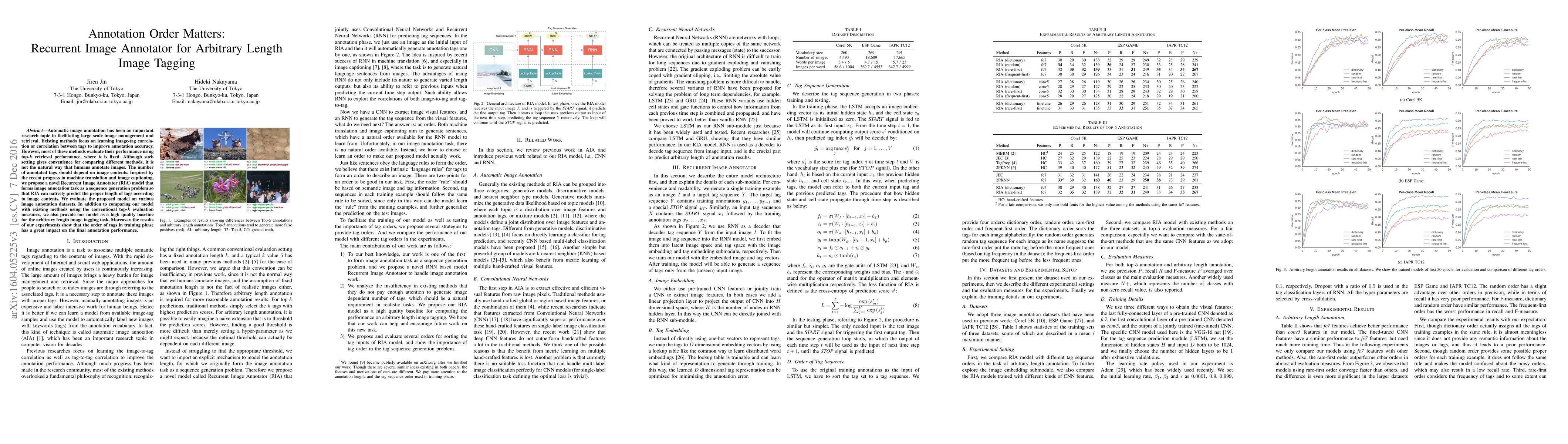 Automatic image annotation has been an important research topic in facilitating large scale image management and retrieval. Existing methods focus on learning image-tag correlation or correlation between tags to improve annotation accuracy. However, most of these methods evaluate their performance using top-k retrieval performance, where k is fixed. Although such setting gives convenience for comparing different methods, it is not the natural way that humans annotate images. The number of annotated tags should depend on image contents. Inspired by the recent progress in machine translation and image captioning, we propose a novel Recurrent Image Annotator (RIA) model that forms image annotation task as a sequence generation problem so that RIA can natively predict the proper length of tags according to image contents. We evaluate the proposed model on various image annotation datasets. In addition to comparing our model with existing methods using the conventional top-k evaluation measures, we also provide our model as a high quality baseline for the arbitrary length image tagging task. Moreover, the results of our experiments show that the order of tags in training phase has a great impact on the final annotation performance.