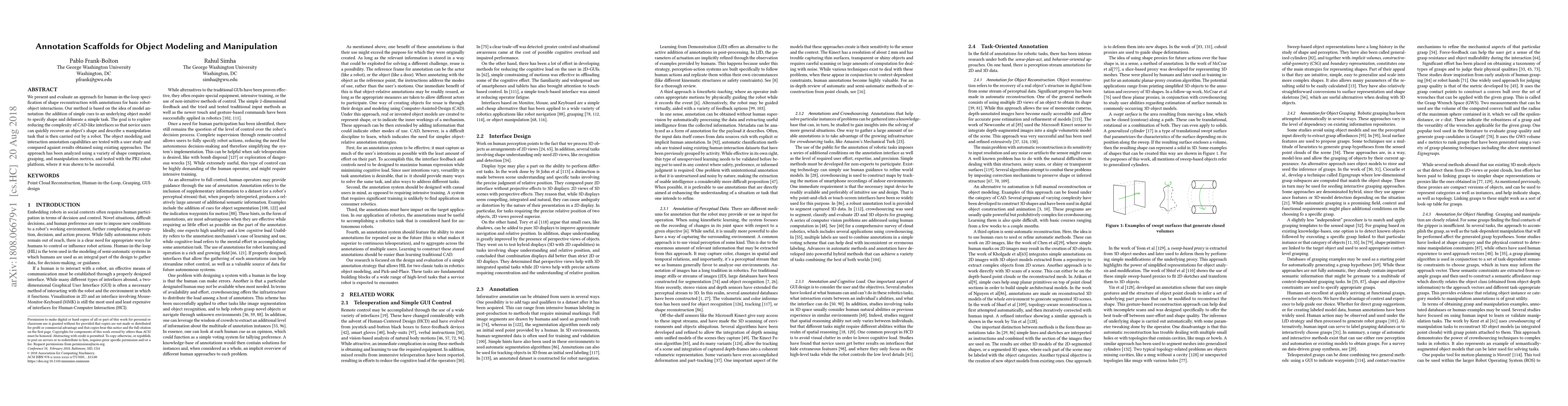 We present and evaluate an approach for human-in-the-loop specification of shape reconstruction with annotations for basic robot-object interactions. Our method is based on the idea of model annotation: the addition of simple cues to an underlying object model to specify shape and delineate a simple task. The goal is to explore reducing the complexity of CAD-like interfaces so that novice users can quickly recover an object's shape and describe a manipulation task that is then carried out by a robot. The object modeling and interaction annotation capabilities are tested with a user study and compared against results obtained using existing approaches. The approach has been analyzed using a variety of shape comparison, grasping, and manipulation metrics, and tested with the PR2 robot platform, where it was shown to be successful.