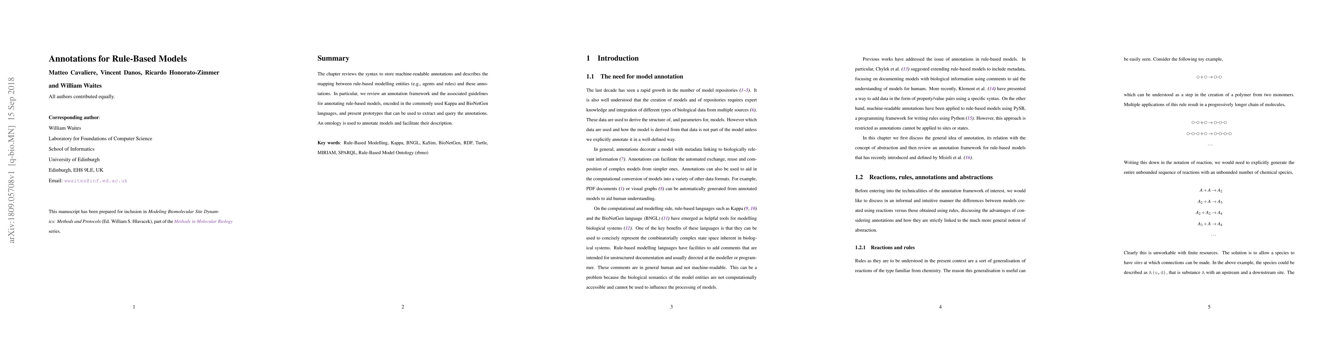 This paper reviews a framework for storing machine-readable annotations for rule-based models, focusing on molecular interactions encoded in Kappa and BioNetGen languages. It presents an ontology-based approach to annotate and query these models, along with prototypes for extracting annotations.