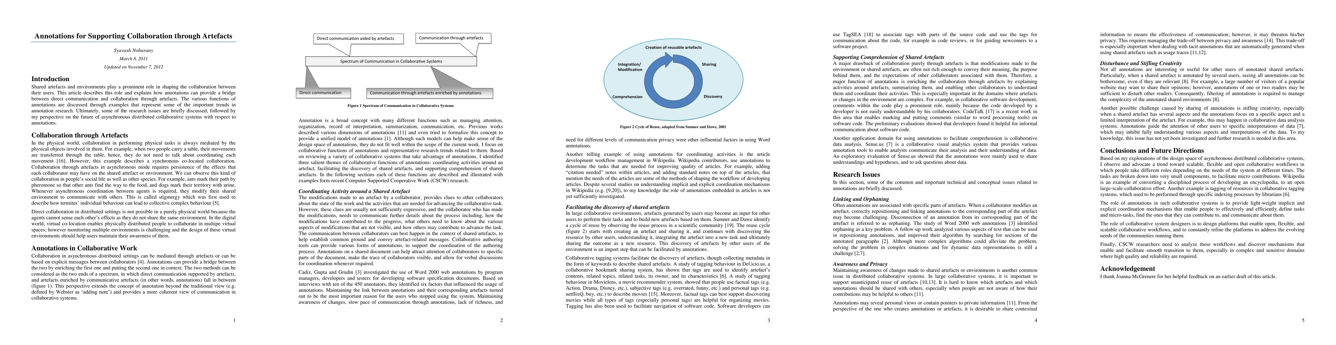 Shared artifacts and environments play a prominent role in shaping the collaboration between their users. This article describes this role and explains how annotations can provide a bridge between direct communication and collaboration through artifacts. The various functions of annotations are discussed through examples that represent some of the important trends in annotation research. Ultimately, some of the research issues are briefly discussed, followed by my perspective on the future of asynchronous distributed collaborative systems with respect to annotations.