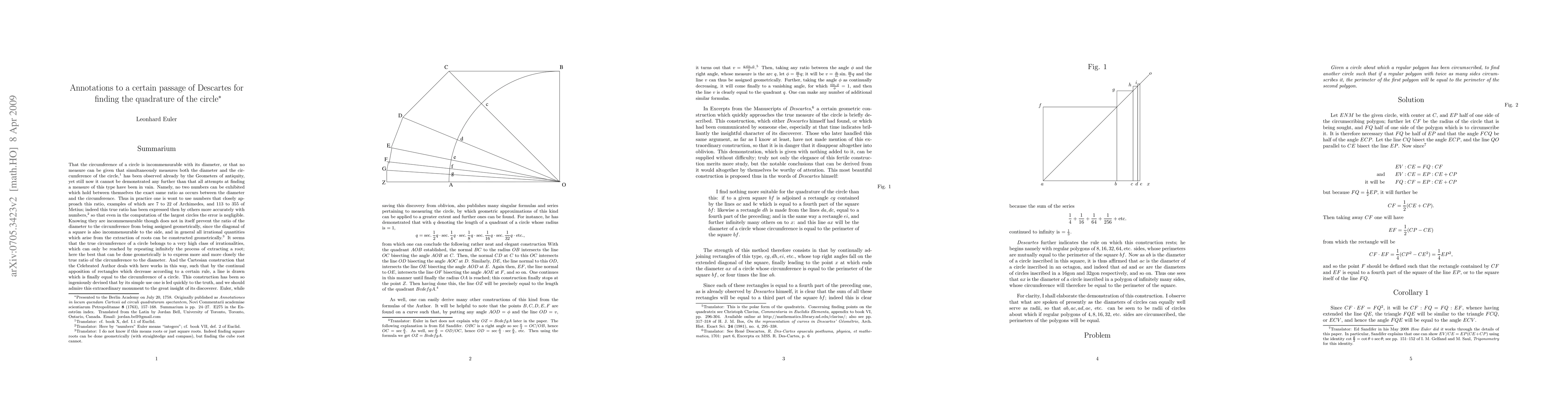 Translation from the Latin of "Annotationes in locum quendam Cartesii ad circuli quadraturam spectantem" (1763). The passage Euler is referring to is the "Excerpta" in part 6, p. 6 of Descartes' 1701 "Opuscula posthuma". Before reading this paper I had not heard of the "quadratrix" before, and I recommend learning a bit about it before reading this. I found Thomas Heath, "A history of Greek mathematics", vol. I, chapter VII to be helpful, in particular pp. 226-230. The quadratrix is a "mechanical curve" that can be used to rectify the circle. The usual problem of squaring the circle is to construct a square with the same area (or perimeter) as a given circle, in a finite number of steps using compass and straightedge. Descartes worked in the reverse direction: from a given square he constructed the radius of a circle with the same perimeter, but in an infinite number of steps. In this paper Euler reconstructs Descartes' argument and develops some consequences of it. Euler finds that \[ \sum_{n=0}^\infty \frac{1}{2^n} \tan \frac{1}{2^n}\phi = \frac{1}{\phi} - 2\cot 2\phi. \] Integrating this yields \[ \prod_{n=1}^\infty \sec \frac{1}{2^n} \phi = \frac{2\phi}{\sin 2\phi}. \] I'd like to thank Davide Crippa from the University of Paris 7 for some helpful back and forth about this paper. One of the only citations to this paper that I have found is in Pietro Ferroni, De calculo integralium exercitatio mathematica, Allegrini, Florence, 1792, pp. xxi--xxiii. The full text of it is available on Google Books.