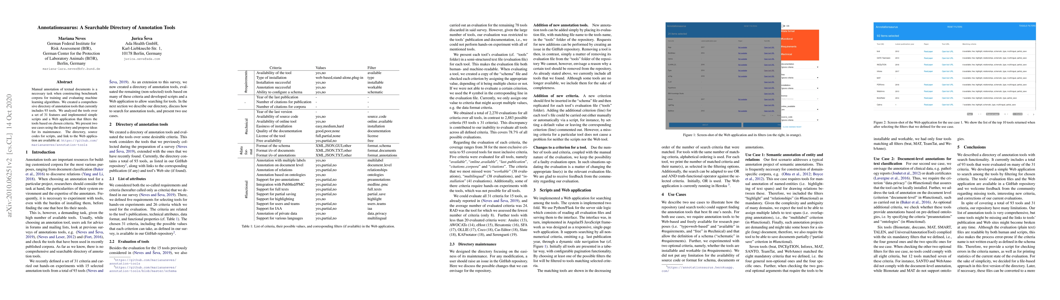 Summary: "Annotationsaurus" provides a comprehensive directory of 93 annotation tools, analyzed over 31 features, with a web application for filtering based on user criteria. The directory is maintained and available for use, along with source codes and a web link.