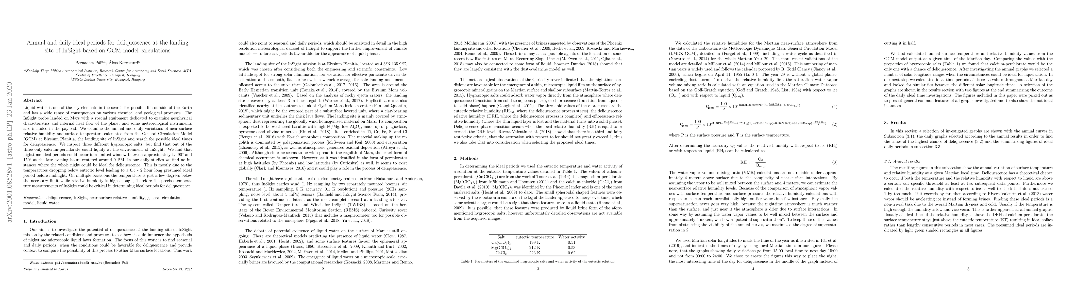 Liquid water is one of the key elements in the search for possible life outside of the Earth and has a wide range of consequences on various chemical and geological processes. The InSight probe landed on Mars with a special equipment dedicated to examine geophysical characteristics and internal heat flow of the planet and some meteorological instruments also included in the payload. We examine the annual and daily variations of near-surface relative humidity and surface temperature calculated from the General Circulation Model (GCM) at Elysium Planitia, the landing site of InSight and search for possible ideal times for deliquescence. We inspect three different hygroscopic salts, but find that out of the three only calcium-perchlorate could liquify at the environment of InSight. We find that nighttime ideal periods could occur in a limited window between approximately Ls 90 and 150 at the late evening hours centered around 9 PM. In our daily studies we find no instances where the whole night could be ideal for deliquescence. This is mostly due to the temperatures dropping below eutectic level leading to a 0.5 - 2 hour long presumed ideal period before midnight. On multiple occasions the temperature is just a few degrees below the necessary limit while relative humidity is high enough, therefore the precise temperature measurements of InSight could be critical in determining ideal periods for deliquescence.