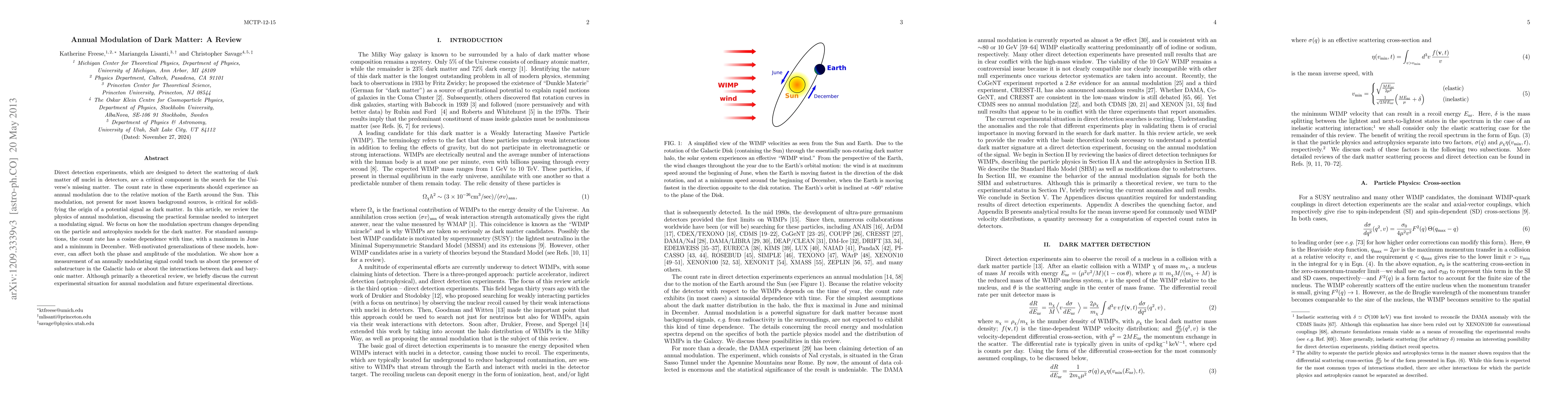 This paper reviews the physics behind the annual modulation expected in dark matter detection experiments, emphasizing the importance of this modulation to distinguish potential dark matter signals from background noise. It discusses the theoretical models and their implications for understanding dark matter properties and interactions.