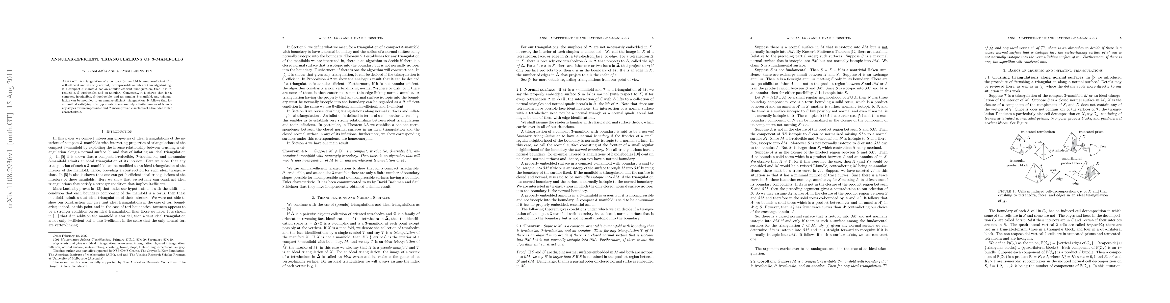 A triangulation of a compact 3-manifold is annular-efficient if it is 0-efficient and the only normal, incompressible annuli are thin edge-linking. If a compact 3-manifold has an annular-efficient triangulation, then it is irreducible, boundary-irreducible, and an-annular. Conversely, it is shown that for a compact, irreducible, boundary-irreducible, and an-annular 3-manifold, any triangulation can be modified to an annular-efficient triangulation. It follows that for a manifold satisfying this hypothesis, there are only a finite number of boundary slopes for incompressible and boundary-incompressible surfaces of a bounded Euler characteristic.