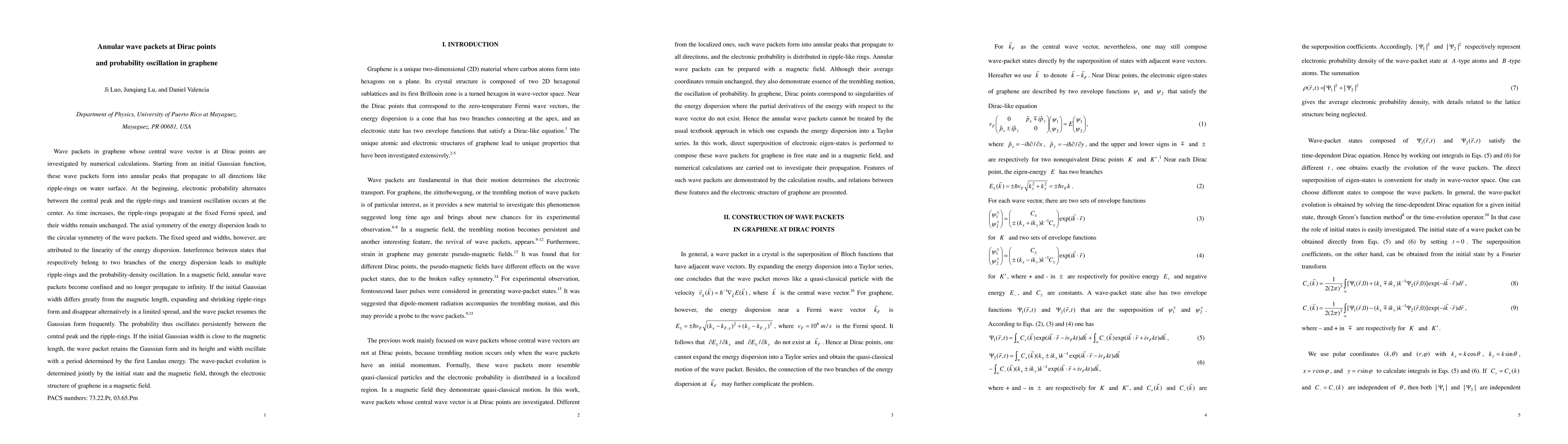 Wave packets in graphene whose central wave vector is at Dirac points are investigated by numerical calculations. Starting from an initial Gaussian function, these wave packets form into annular peaks that propagate to all directions like ripple-rings on water surface. At the beginning, electronic probability alternates between the central peak and the ripple-rings and transient oscillation occurs at the center. As time increases, the ripple-rings propagate at the fixed Fermi speed, and their widths remain unchanged. The axial symmetry of the energy dispersion leads to the circular symmetry of the wave packets. The fixed speed and widths, however, are attributed to the linearity of the energy dispersion. Interference between states that respectively belong to two branches of the energy dispersion leads to multiple ripple-rings and the probability-density oscillation. In a magnetic field, annular wave packets become confined and no longer propagate to infinity. If the initial Gaussian width differs greatly from the magnetic length, expanding and shrinking ripple-rings form and disappear alternatively in a limited spread, and the wave packet resumes the Gaussian form frequently. The probability thus oscillates persistently between the central peak and the ripple-rings. If the initial Gaussian width is close to the magnetic length, the wave packet retains the Gaussian form and its height and width oscillate with a period determined by the first Landau energy. The wave-packet evolution is determined jointly by the initial state and the magnetic field, through the electronic structure of graphene in a magnetic field.