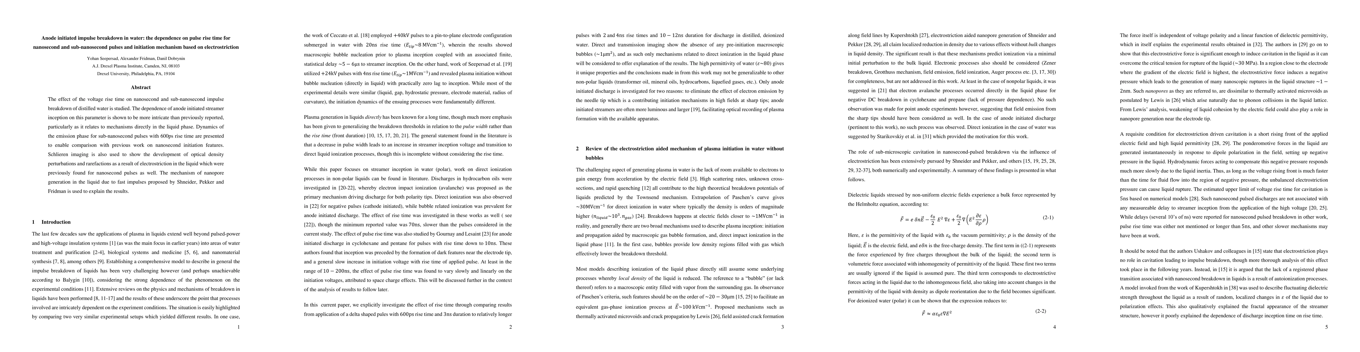 This paper investigates how the rise time of nanosecond and sub-nanosecond pulses affects the breakdown of distilled water, revealing a more complex relationship than previously understood. The study uses schlieren imaging to demonstrate electrostriction-induced optical density changes, supporting the proposed electrostriction-based mechanism for nanopore generation.