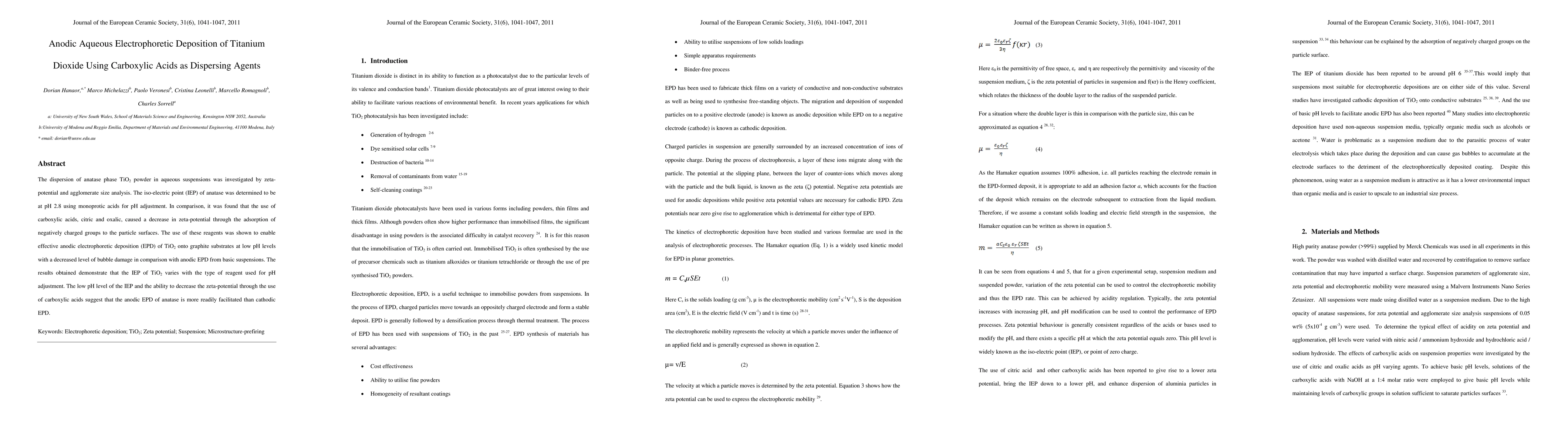Researchers found that carboxylic acids facilitate anodic electrophoretic deposition of titanium dioxide at low pH levels, reducing bubble damage compared to basic suspensions. The study also showed the dispersion of TiO2 powder in aqueous suspensions improves with the use of these reagents.
