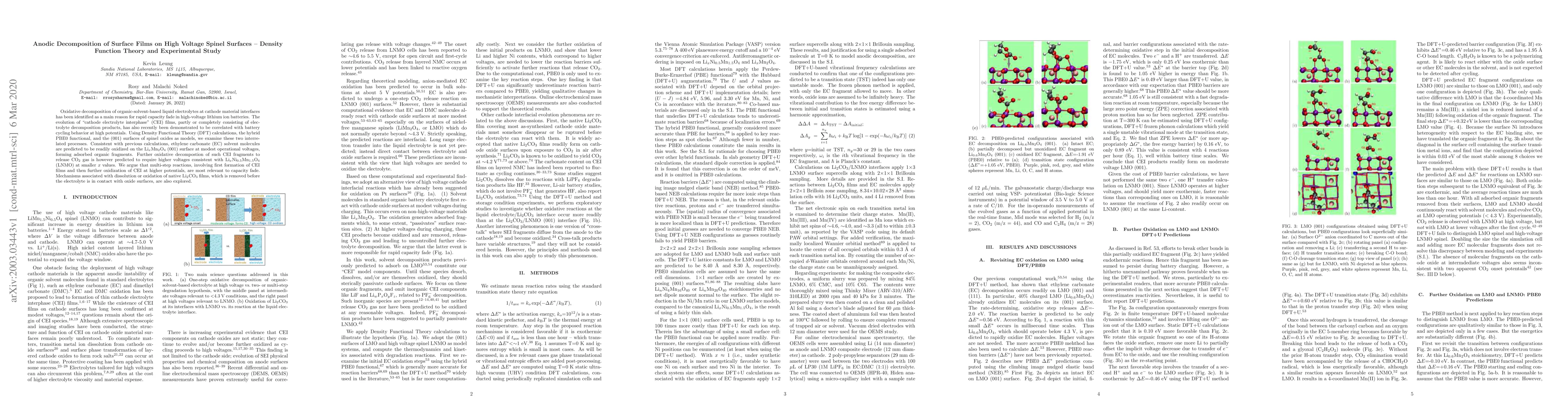 Oxidative decomposition of organic-solvent-based liquid electrolytes at cathode material interfaces has been identified as a main reason for rapid capacity fade in high-voltage lithium ion batteries. The evolution of "cathode electrolyte interphase: (CEI) films, partly or completely consisting of electrolyte decomposition products, has also recently been demonstrated to be correlated with battery cycling behavior at high potentials. Using Density Functional Theory (DFT) calculations, the hybrid PBE0 functional, and the (001) surfaces of spinel oxides as models, we examine these two interrelated processes. Consistent with previous calculations, ethylene carbonate (EC) solvent molecules are predicted to be readily oxidized on the Li(x)Mn(2)O(4) (001) surface at modest operational voltages, forming adsorbed organic fragments. Further oxidative decompostion of such CEI fragments to release CO2 gas is however predicted to require higher voltages consistent with Li(x)Ni(0.5)Mn(1.5)O(4) (LNMO) at smaller x values. We argue that multi-step reactions, involving first formation of CEI films and then further oxidization of CEI at higher potentials, are most relevant to capacity fade. Mechanisms associated with dissolution or oxidation of native Li2CO3 films, which is removed before the electrolyte is in contact with oxide surfaces, are also explored.