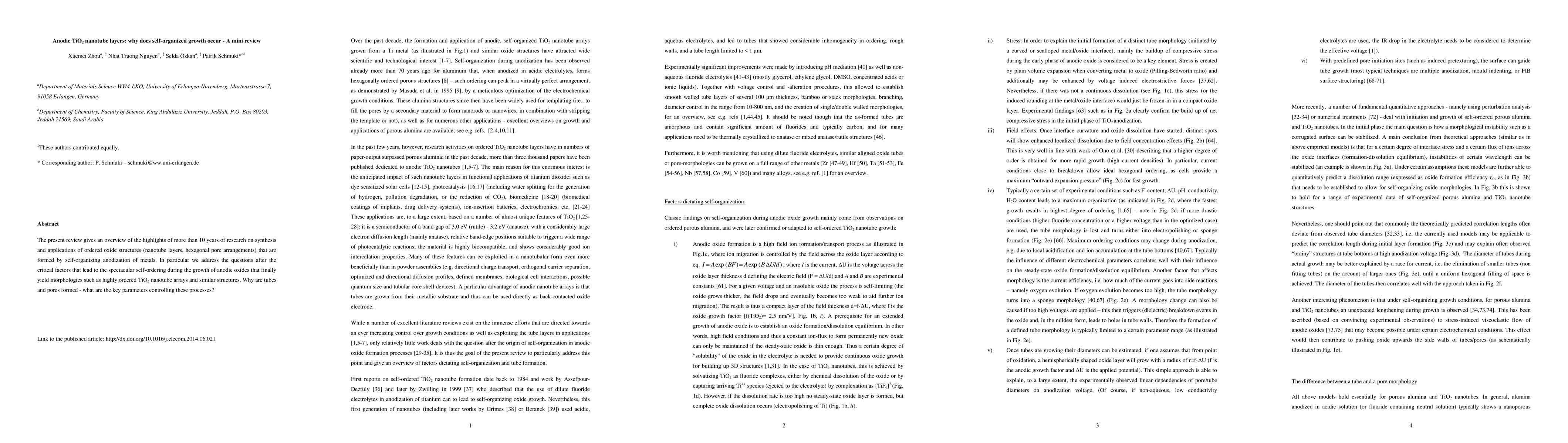 The present review gives an overview of the highlights of more than 10 years of research on synthesis and applications of ordered oxide structures (nanotube layers, hexagonal pore arrangements) that are formed by self-organizing anodization of metals. In particular we address the questions after the critical factors that lead to the spectacular self-ordering during the growth of anodic oxides that finally yield morphologies such as highly ordered TiO2 nanotube arrays and similar structures. Why are tubes and pores formed - what are the key parameters controlling these processes?