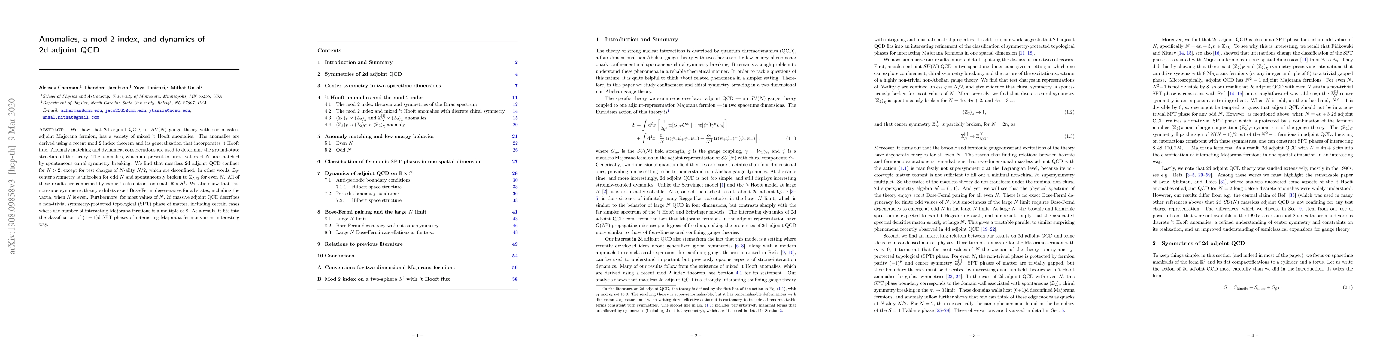 We show that $2$d adjoint QCD, an $SU(N)$ gauge theory with one massless adjoint Majorana fermion, has a variety of mixed 't Hooft anomalies. The anomalies are derived using a recent mod $2$ index theorem and its generalization that incorporates 't Hooft flux. Anomaly matching and dynamical considerations are used to determine the ground-state structure of the theory. The anomalies, which are present for most values of $N$, are matched by spontaneous chiral symmetry breaking. We find that massless $2$d adjoint QCD confines for $N >2$, except for test charges of $N$-ality $N/2$, which are deconfined. In other words, $\mathbb Z_N$ center symmetry is unbroken for odd $N$ and spontaneously broken to $\mathbb Z_{N/2}$ for even $N$. All of these results are confirmed by explicit calculations on small $\mathbb{R}\times S^1$. We also show that this non-supersymmetric theory exhibits exact Bose-Fermi degeneracies for all states, including the vacua, when $N$ is even. Furthermore, for most values of $N$, $2$d massive adjoint QCD describes a non-trivial symmetry-protected topological (SPT) phase of matter, including certain cases where the number of interacting Majorana fermions is a multiple of $8$. As a result, it fits into the classification of $(1+1)$d SPT phases of interacting Majorana fermions in an interesting way.