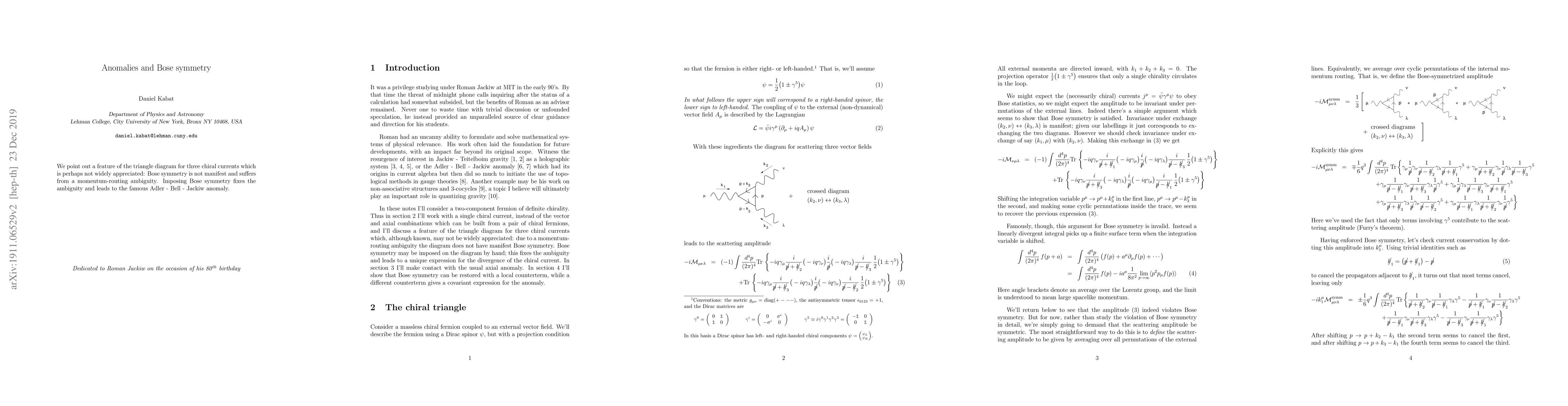We point out a feature of the triangle diagram for three chiral currents which is perhaps not widely appreciated: Bose symmetry is not manifest and suffers from a momentum-routing ambiguity. Imposing Bose symmetry fixes the ambiguity and leads to the famous Adler - Bell - Jackiw anomaly.