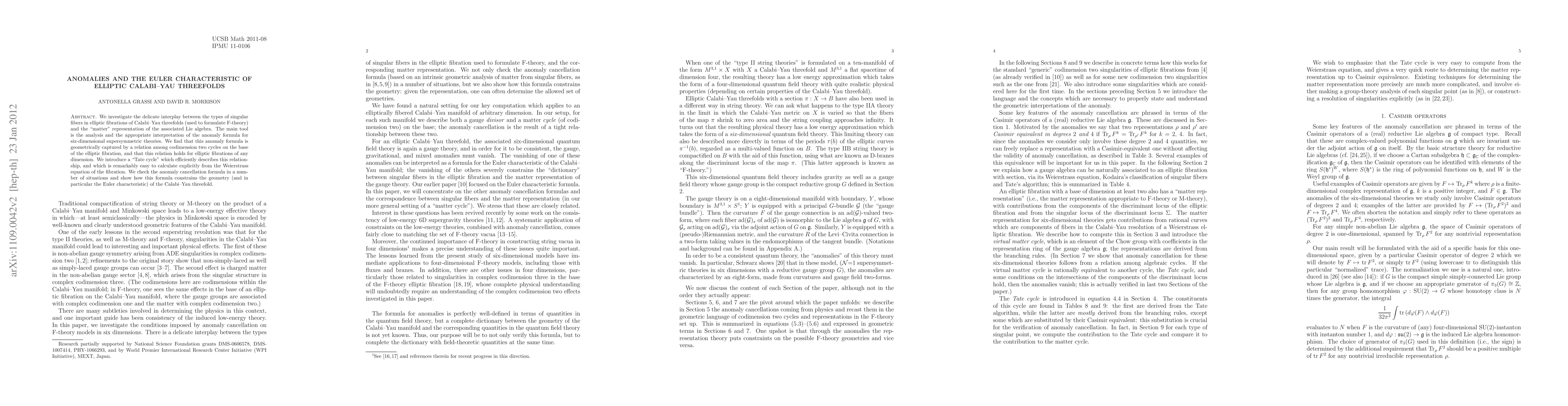 We investigate the delicate interplay between the types of singular fibers in elliptic fibrations of Calabi-Yau threefolds (used to formulate F-theory) and the "matter" representation of the associated Lie algebra. The main tool is the analysis and the appropriate interpretation of the anomaly formula for six-dimensional supersymmetric theories. We find that this anomaly formula is geometrically captured by a relation among codimension two cycles on the base of the elliptic fibration, and that this relation holds for elliptic fibrations of any dimension. We introduce a "Tate cycle" which efficiently describes this relationship, and which is remarkably easy to calculate explicitly from the Weierstrass equation of the fibration. We check the anomaly cancellation formula in a number of situations and show how this formula constrains the geometry (and in particular the Euler characteristic) of the Calabi-Yau threefold.