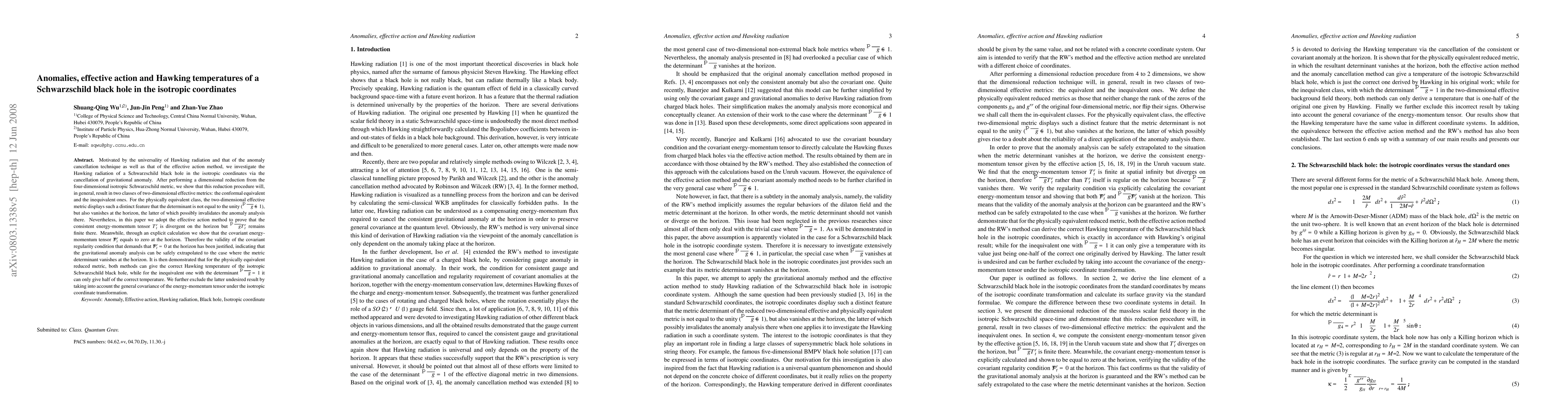 This paper explores the Hawking radiation of a Schwarzschild black hole using isotropic coordinates and anomaly cancellation techniques. It finds two classes of two-dimensional effective metrics from the dimensional reduction of the four-dimensional Schwarzschild metric, with the physically equivalent class showing a vanishing determinant at the horizon, potentially invalidating anomaly analysis there.