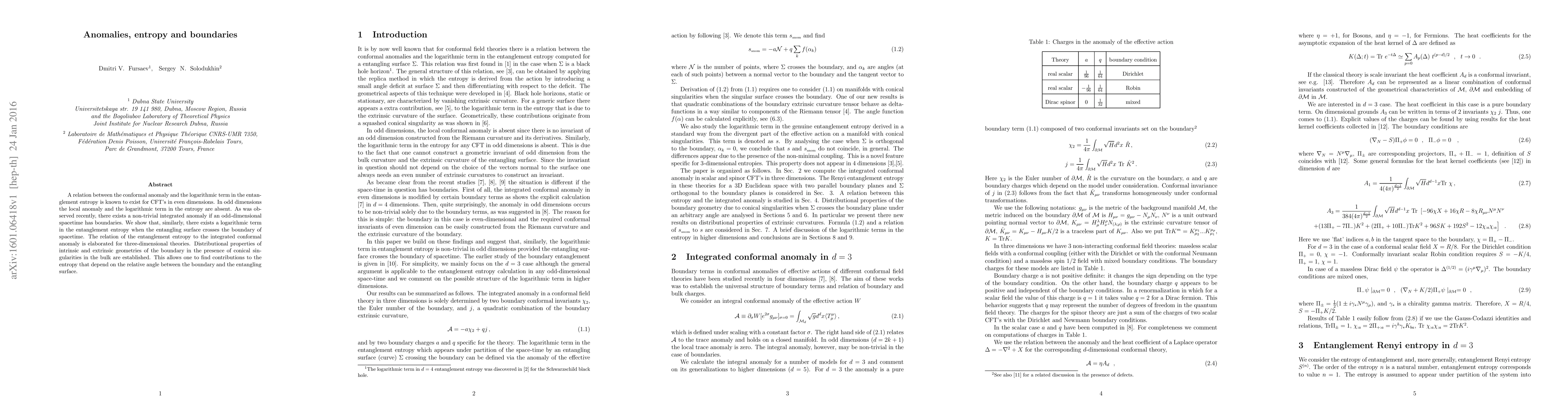 A relation between the conformal anomaly and the logarithmic term in the entanglement entropy is known to exist for CFT's in even dimensions. In odd dimensions the local anomaly and the logarithmic term in the entropy are absent. As was observed recently, there exists a non-trivial integrated anomaly if an odd-dimensional spacetime has boundaries. We show that, similarly, there exists a logarithmic term in the entanglement entropy when the entangling surface crosses the boundary of spacetime. The relation of the entanglement entropy to the integrated conformal anomaly is elaborated for three-dimensional theories. Distributional properties of intrinsic and extrinsic geometries of the boundary in the presence of conical singularities in the bulk are established. This allows one to find contributions to the entropy that depend on the relative angle between the boundary and the entangling surface.