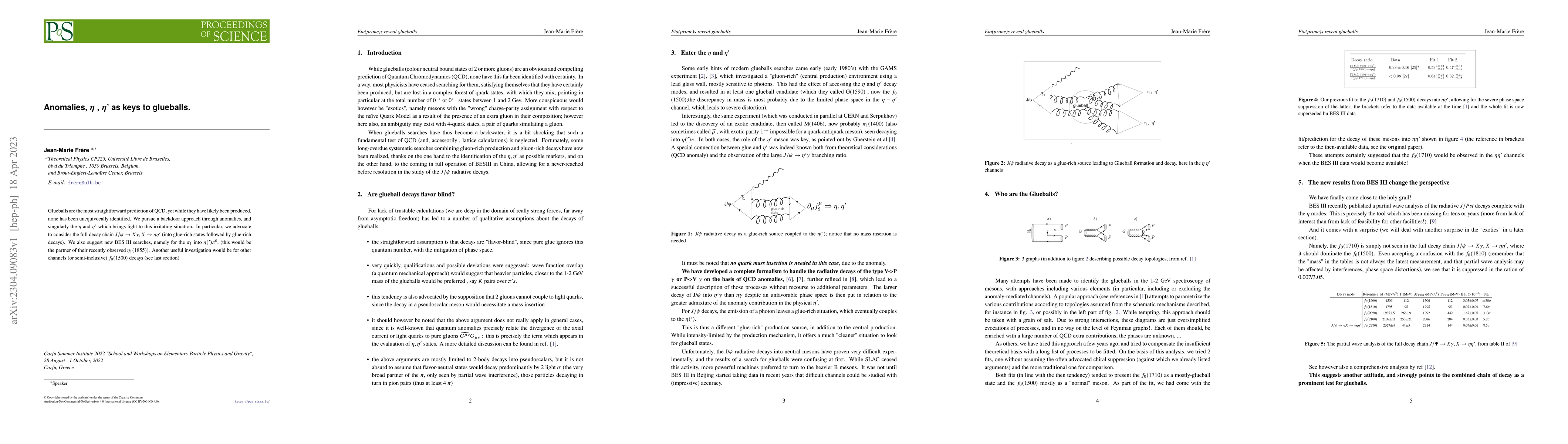 Glueballs are the most straightforward prediction of QCD, yet while they have likely been produced, none has been unequivocally identified. We pursue a backdoor approach through anomalies, and singularly the $\eta$ and $\eta$' which brings light to this irritating situation. In particular, we advocate to consider the full decay chain $J/\psi \rightarrow X \gamma , X \rightarrow \eta \eta'$ (into glue-rich states followed by glue-rich decays). We also suggest new BES III searches, namely for the $\pi_1$ into $\eta(') \pi^0$, (this would be the partner of their recently observed $\eta_1(1855)$). Another useful investigation would be for other channels (or semi-inclusive) $f_0 (1500)$ decays (see last section)