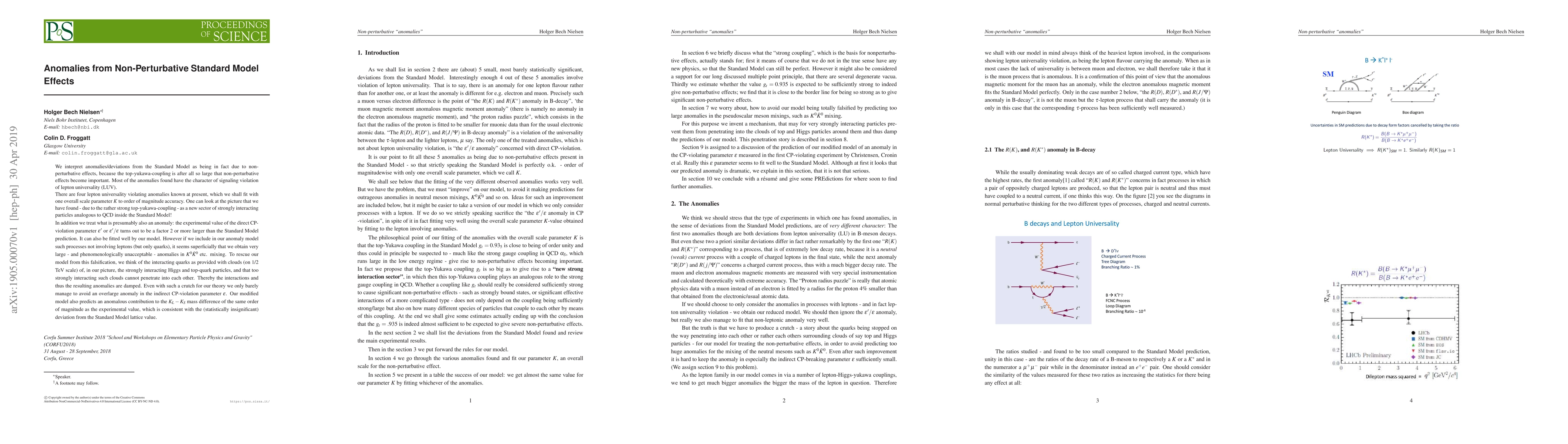 This paper proposes that anomalies in the Standard Model arise from non-perturbative effects due to the large top Yukawa coupling, suggesting a new sector of strongly interacting particles. It fits four lepton universality violating anomalies and addresses discrepancies in charge conjugation parity violation parameters, though it introduces a theoretical "cloud" to dampen quark interactions and avoid unacceptable anomalies in meson mixing.
