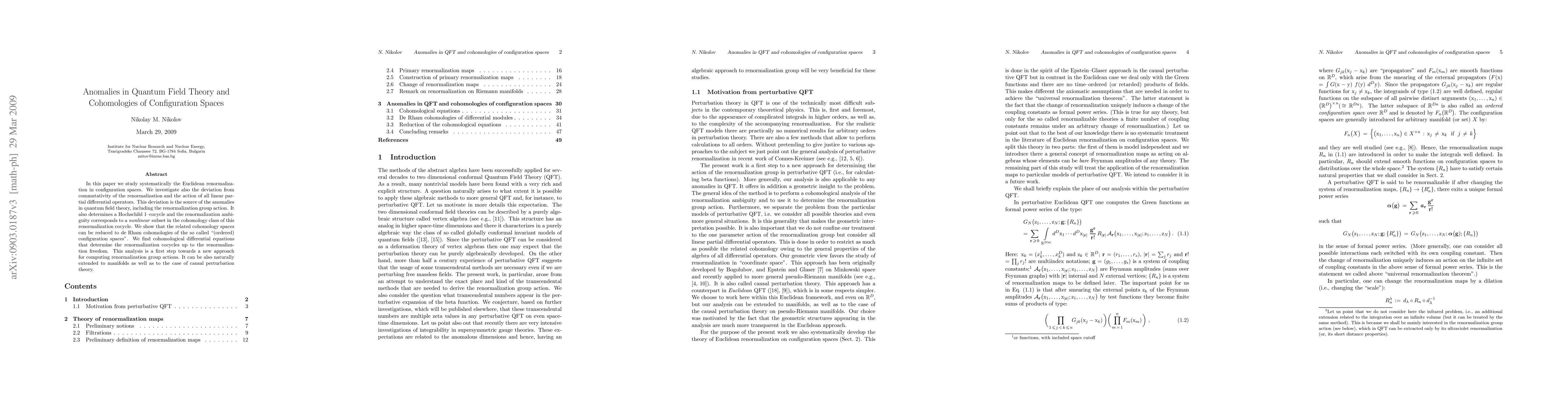 This paper systematically explores Euclidean renormalization in configuration spaces, identifying anomalies in quantum field theory arising from deviations in commutativity of renormalization and differential operators. It links these anomalies to Hochschild 1-cocycles and demonstrates their reduction to de Rham cohomologies of configuration spaces, paving the way for a new approach to renormalization group computations.