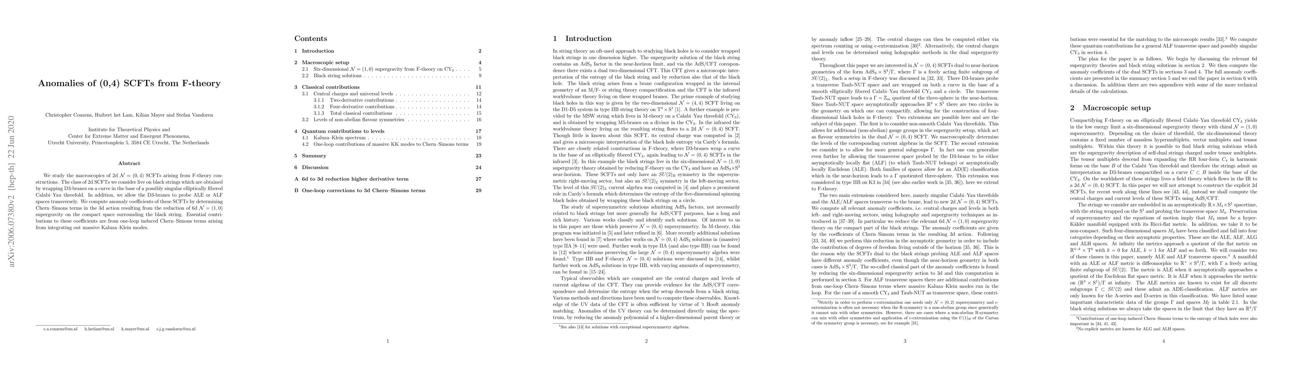 This paper investigates 2d $\mathcal{N}=(0,4)$ SCFTs derived from F-theory, focusing on those on black strings from D3-brane wraps. The authors compute anomaly coefficients by examining Chern-Simons terms in the 3d action, finding essential contributions from one-loop induced terms from massive Kaluza-Klein modes.