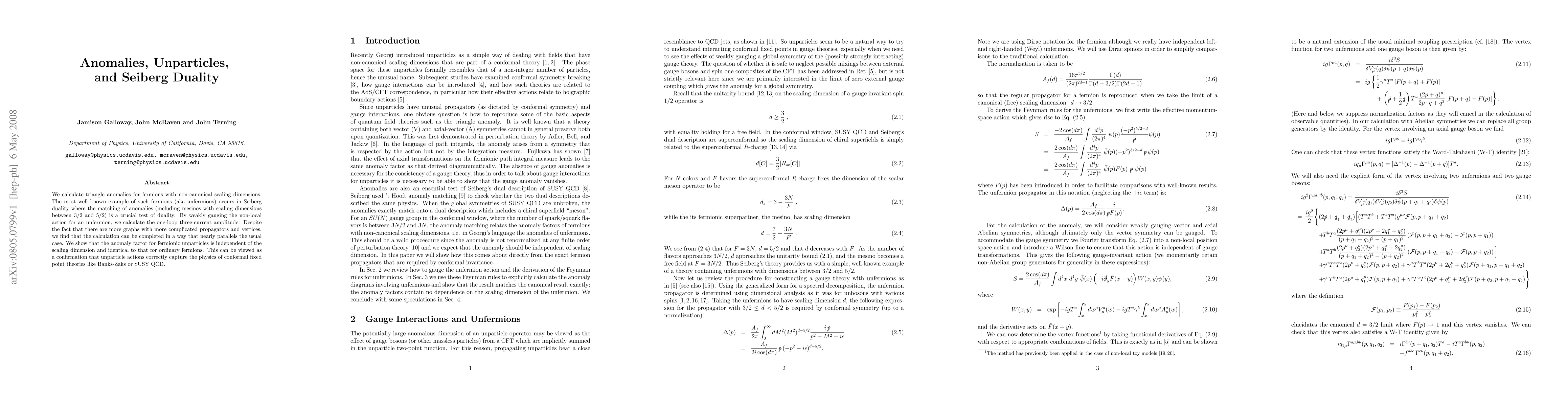 We calculate triangle anomalies for fermions with non-canonical scaling dimensions. The most well known example of such fermions (aka unfermions) occurs in Seiberg duality where the matching of anomalies (including mesinos with scaling dimensions between 3/2 and 5/2) is a crucial test of duality. By weakly gauging the non-local action for an unfermion, we calculate the one-loop three-current amplitude. Despite the fact that there are more graphs with more complicated propagators and vertices, we find that the calculation can be completed in a way that nearly parallels the usual case. We show that the anomaly factor for fermionic unparticles is independent of the scaling dimension and identical to that for ordinary fermions. This can be viewed as a confirmation that unparticle actions correctly capture the physics of conformal fixed point theories like Banks-Zaks or SUSY QCD.