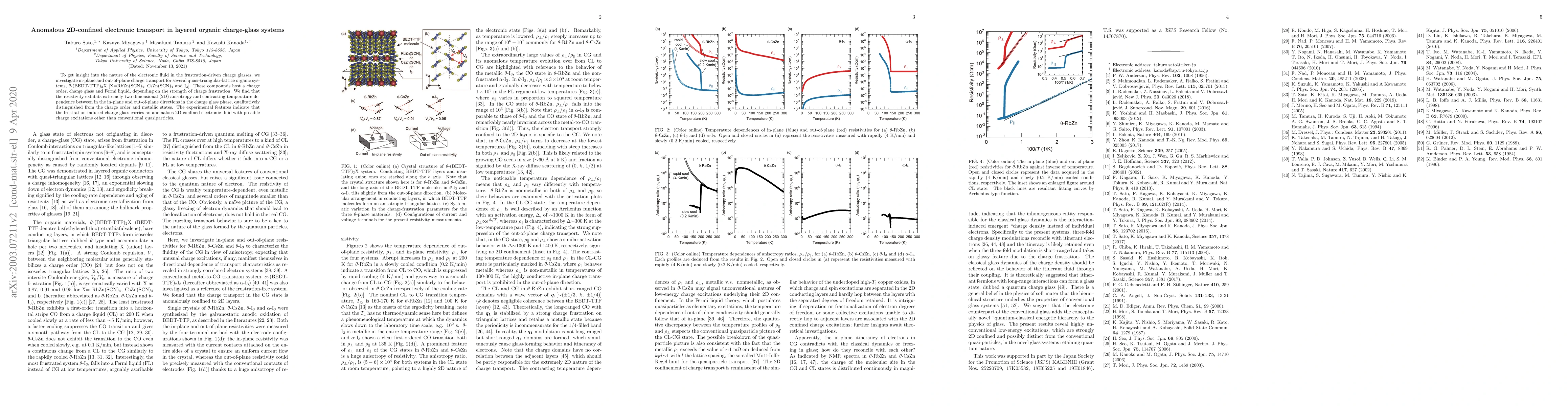To get insight into the nature of the electronic fluid in the frustration-driven charge glasses, we investigate in-plane and out-of-plane charge transport for several quasi-triangular-lattice organic systems, $\theta$-(BEDT-TTF)$_2$X [X=RbZn(SCN)$_4$, CsZn(SCN)$_4$ and I$_3$]. These compounds host a charge order, charge glass and Fermi liquid, depending on the strength of charge frustration. We find that the resistivity exhibits extremely two-dimensional (2D) anisotropy and contrasting temperature dependence between in the in-plane and out-of-plane directions in the charge glass phase, qualitatively distinguished from the charge order and metallic states. The experimental features indicate that the frustration-induced charge glass carries an anomalous 2D-confined electronic fluid with possible charge excitations other than conventional quasiparticles.