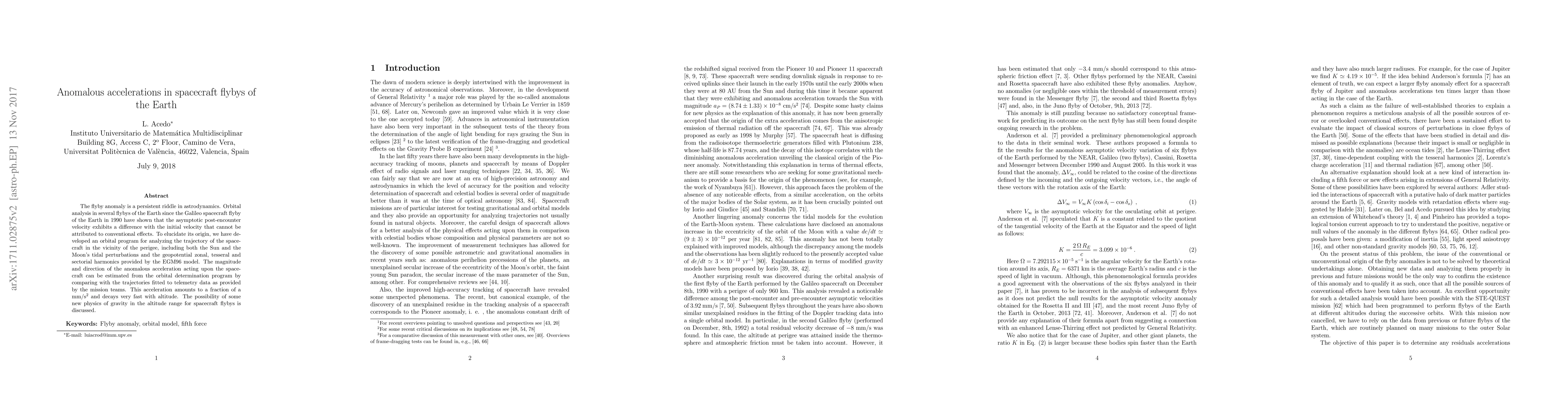 The flyby anomaly, an unexplained discrepancy in spacecraft velocities during Earth flybys, has been analyzed using an advanced orbital program incorporating solar and lunar perturbations and geopotential harmonics. The anomalous acceleration detected is a small fraction of mm/s², prompting discussions on potential new gravitational physics.