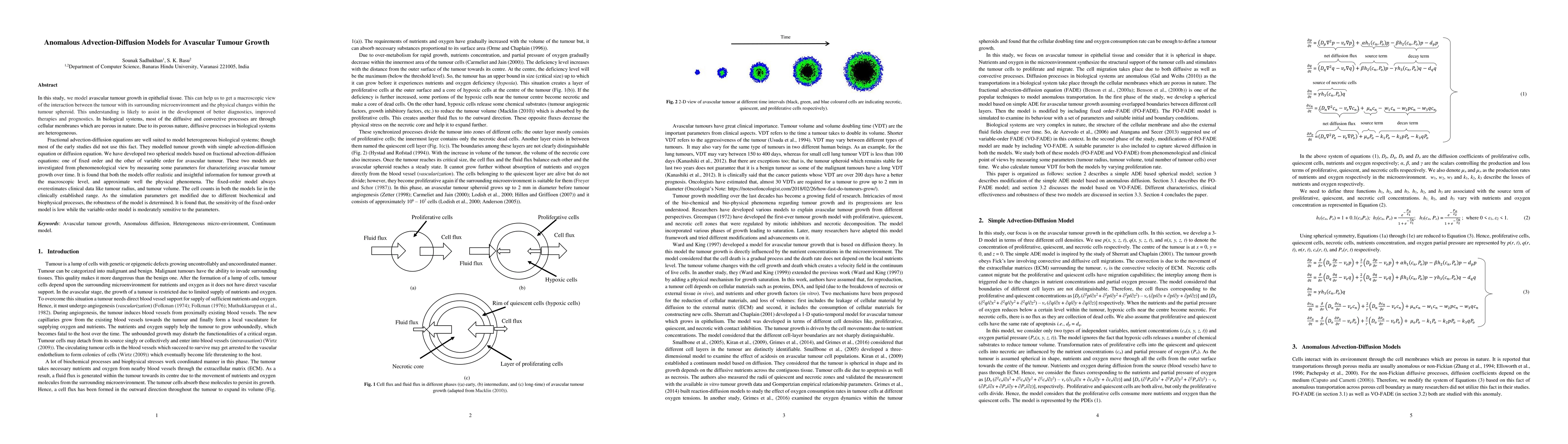 The study develops two spherical models based on fractional advection-diffusion equations (FO-FADE and VO-FADE) to model avascular tumour growth in epithelial tissue, investigating their phenomenological aspects by measuring tumour growth parameters over time.