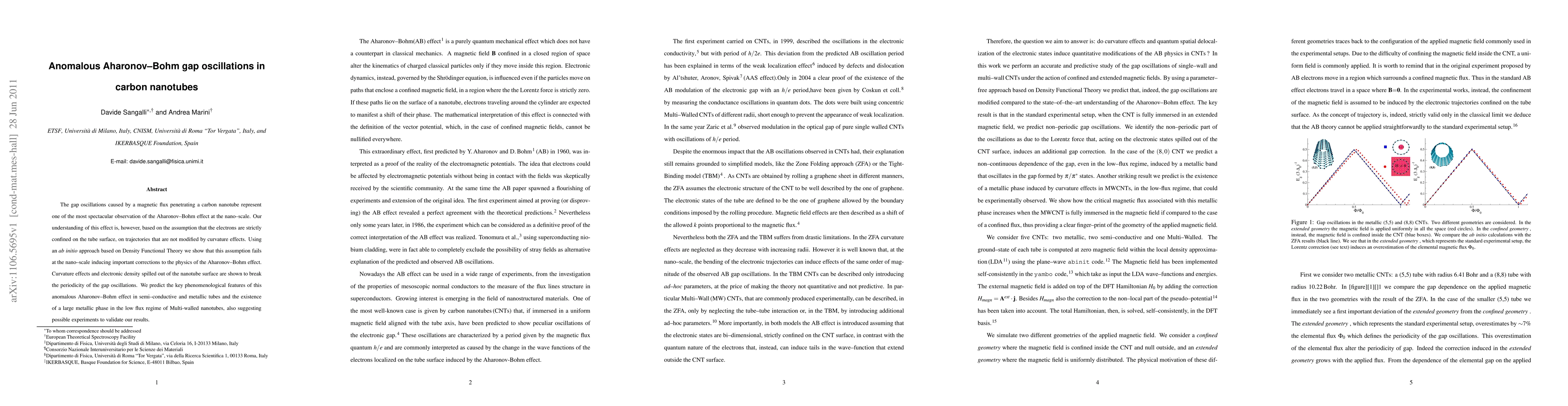 The gap oscillations caused by a magnetic flux penetrating a carbon nanotube represent one of the most spectacular observation of the Aharonov-Bohm effect at the nano--scale. Our understanding of this effect is, however, based on the assumption that the electrons are strictly confined on the tube surface, on trajectories that are not modified by curvature effects. Using an ab-initio approach based on Density Functional Theory we show that this assumption fails at the nano-scale inducing important corrections to the physics of the Aharonov-Bohm effect. Curvature effects and electronic density spilled out of the nanotube surface are shown to break the periodicity of the gap oscillations. We predict the key phenomenological features of this anomalous Aharonov-Bohm effect in semi-conductive and metallic tubes and the existence of a large metallic phase in the low flux regime of Multi-walled nanotubes, also suggesting possible experiments to validate our results.