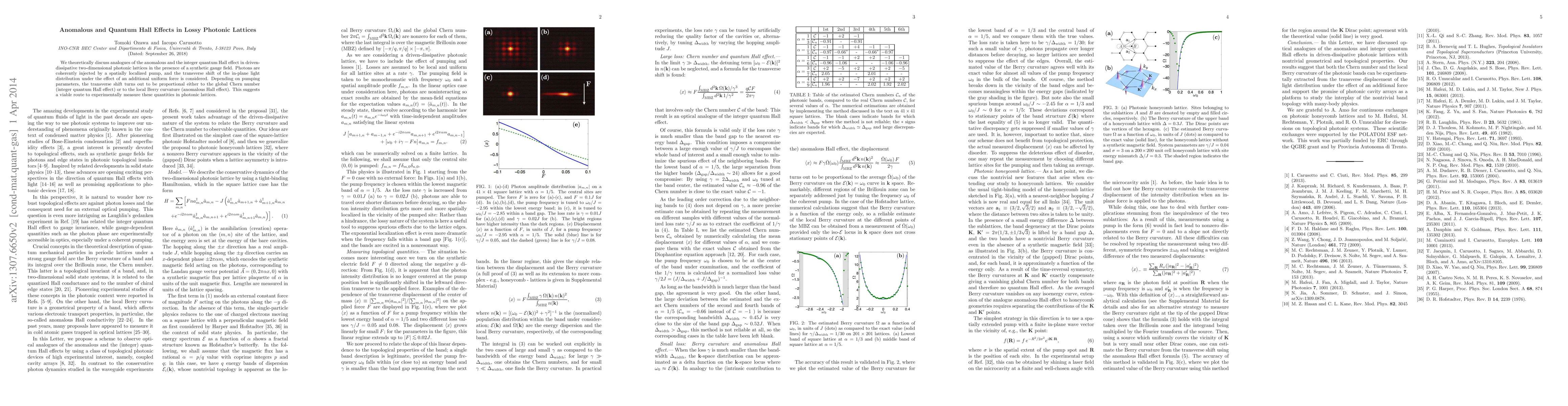 This paper theoretically explores analogues of the anomalous and integer quantum Hall effects in driven-dissipative photonic lattices, showing that photons exhibit transverse shifts proportional to either the global Chern number or the local Berry curvature depending on pumping parameters, suggesting a method for experimentally measuring these quantities.