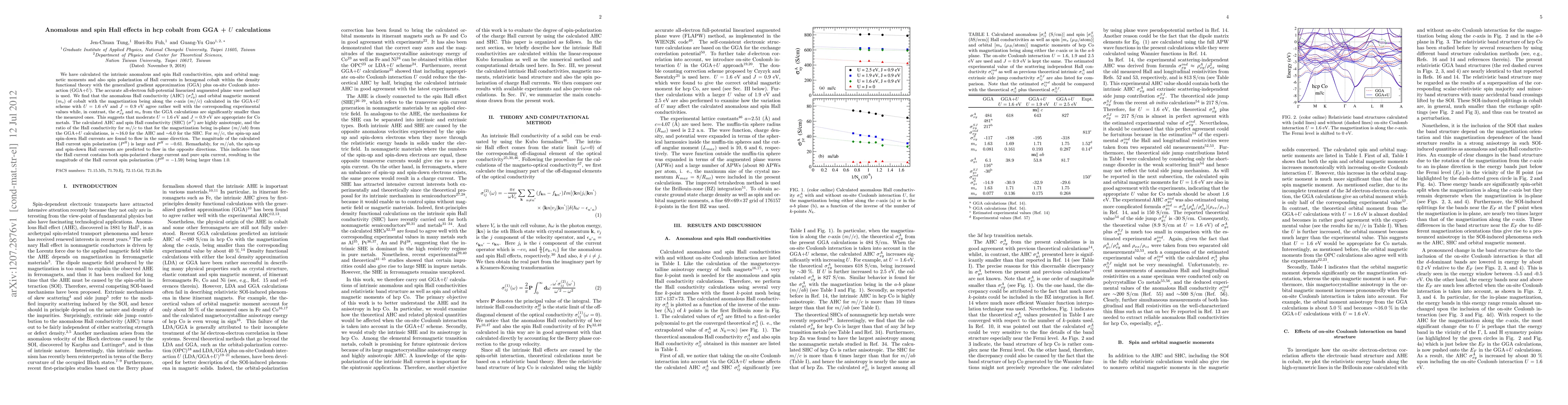This study calculates the anomalous and spin Hall effects in hexagonal cobalt using GGA + U calculations, finding that the GGA+$U$ method with $U = 1.6$ eV and $J = 0.9$ eV better matches experimental values compared to GGA alone. The calculated Hall conductivities show significant anisotropy, with the spin-up and spin-down Hall currents flowing in opposite directions for in-plane magnetization, leading to a Hall current spin polarization greater than 1.0.
