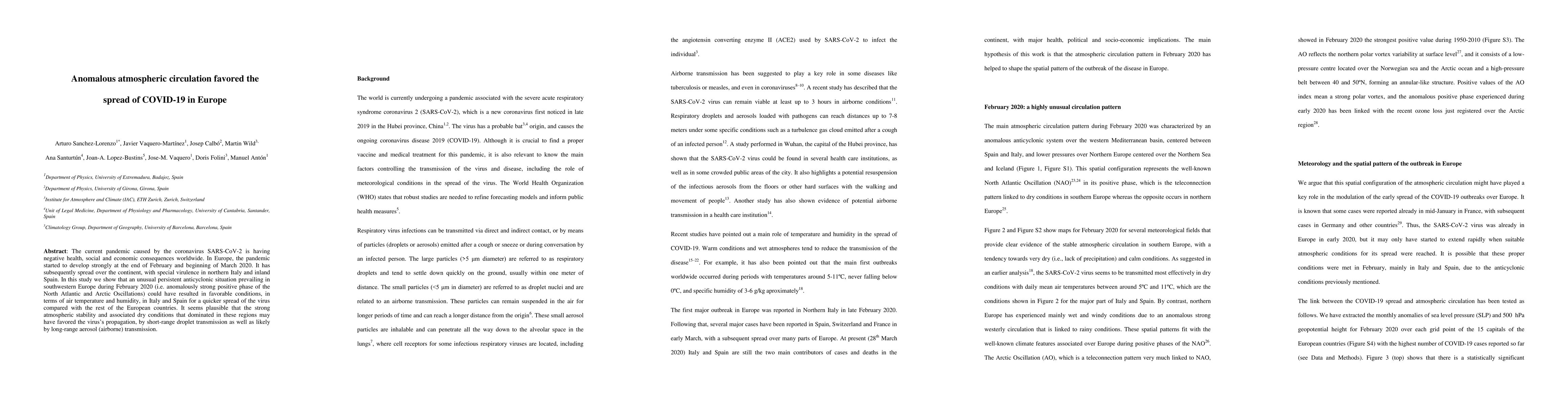A study suggests that an unusual atmospheric circulation pattern in February 2020 may have favored the spread of COVID-19 in Europe due to favorable air temperature and humidity conditions, particularly in northern Italy and inland Spain.