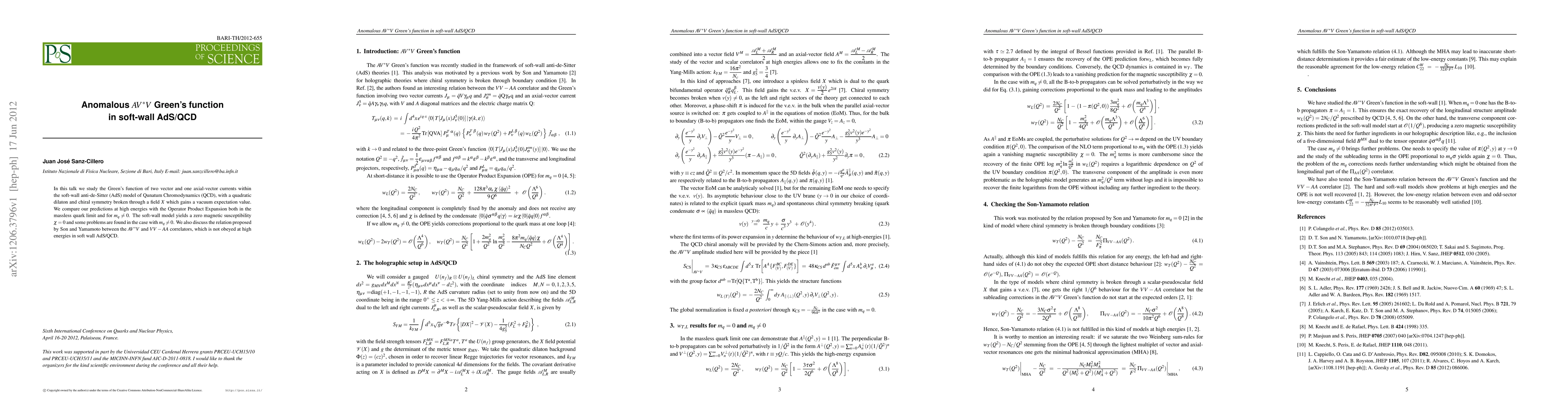 In this talk we study the Green's function of two vector and one axial-vector currents within the soft-wall anti-de-Sitter (AdS) model of Qunatum Chromodynamics (QCD), with a quadratic dilaton and chiral symmetry broken through a field X which gains a vacuum expectation value. We compare our predictions at high energies with the Operator Product Expansion both in the massless quark limit and for mq different from 0. The soft-wall model yields a zero magnetic susceptibility chi=0 and some problems are found in the case with mq different from 0. We also discuss the relation proposed by Son and Yamamoto between the AV*V and VV-AA correlators, which is not obeyed at high energies in soft wall AdS/QCD.