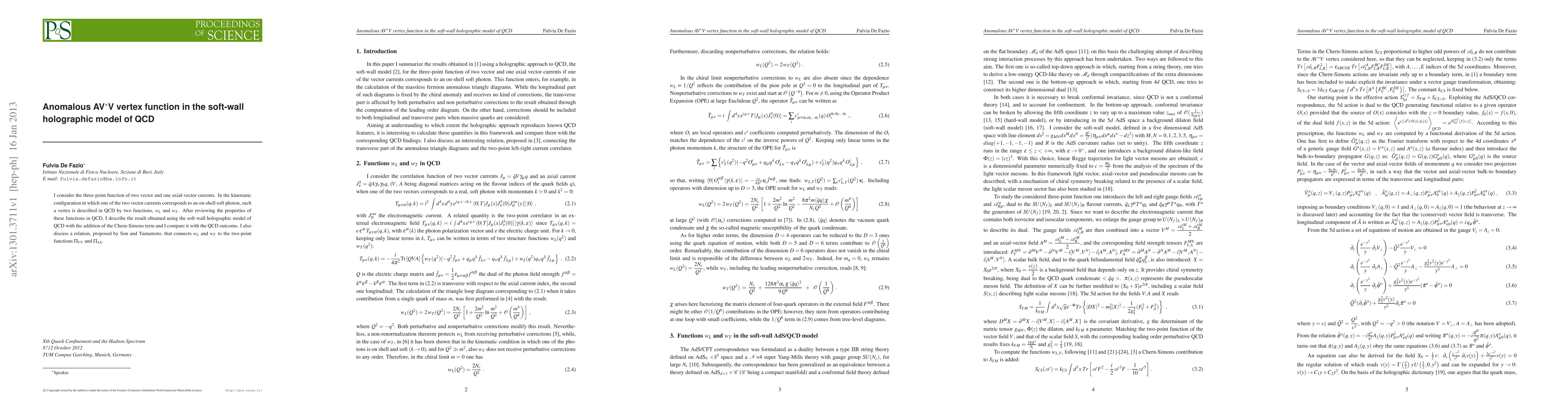 This paper investigates the anomalous three-point vertex function in the soft-wall holographic model of QCD, focusing on the $AV^*V$ vertex where one vector current is an on-shell soft photon. It compares the results from the holographic model, including the Chern-Simons term, with standard QCD predictions and discusses a proposed relation linking the vertex functions to two-point functions.