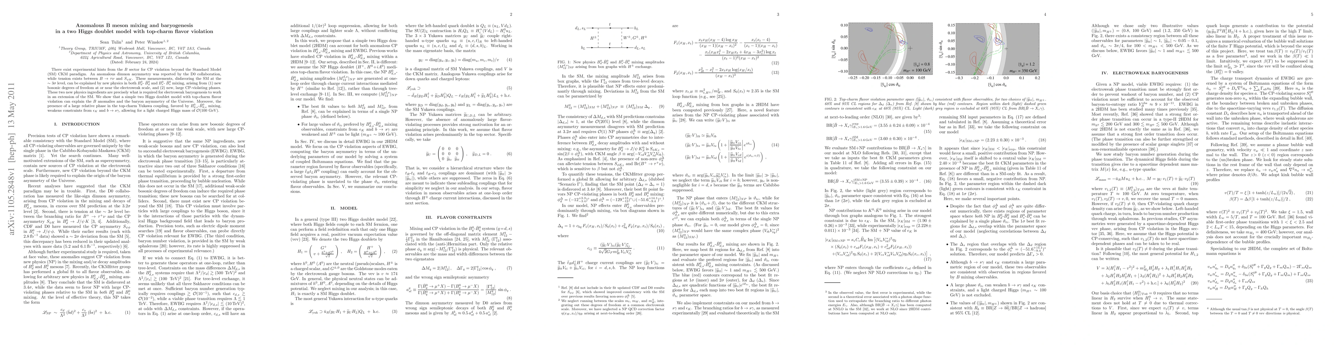 There exist experimental hints from the B sector for CP violation beyond the Standard Model (SM) CKM paradigm. An anomalous dimuon asymmetry was reported by the D0 collaboration, while tension exists between $B \to \tau \nu$ and $S_{\psi K}$. These measurements, disfavoring the SM at the ~3$\sigma$ level, can be explained by new physics in both $B_d$-$\bar{B}_d$ and $B_s$- $\bar{B}_s$ mixing, arising from (1) new bosonic degrees of freedom at or near the electroweak scale, and (2) new, large CP-violating phases. These two new physics ingredients are precisely what is required for electroweak baryogenesis to work in an extension of the SM. We show that a simple two Higgs doublet model with top-charm flavor violation can explain the B anomalies and the baryon asymmetry of the Universe. Moreover, the presence of a large relative phase in the top-charm Yukawa coupling, favored by $B_{d,s}$-$\bar{B}_{d,s}$ mixing, weakens constraints from $\epsilon_K$ and $b \to s \gamma$, allowing for a light charged Higgs mass of O(100 GeV).