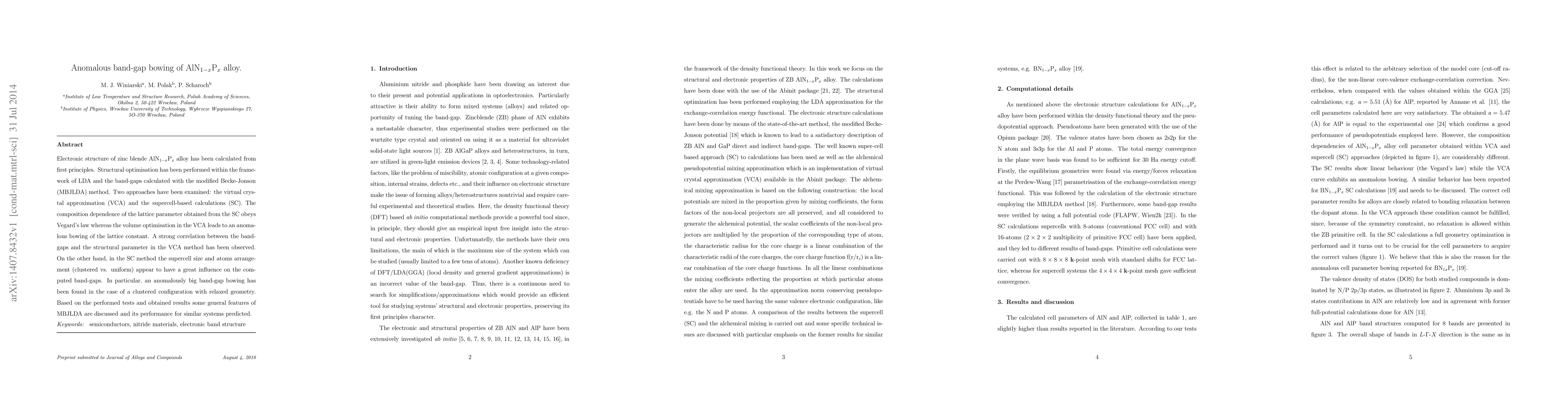 Electronic structure of zinc blende AlN(1-x)$Px alloy has been calculated from first principles. Structural optimisation has been performed within the framework of LDA and the band-gaps calculated with the modified Becke-Jonson (MBJLDA) method. Two approaches have been examined: the virtual crystal approximation (VCA) and the supercell-based calculations (SC). The composition dependence of the lattice parameter obtained from the SC obeys Vegard's law whereas the volume optimisation in the VCA leads to an anomalous bowing of the lattice constant. A strong correlation between the band-gaps and the structural parameter in the VCA method has been observed. On the other hand, in the SC method the supercell size and atoms arrangement (clustered vs. uniform) appear to have a great influence on the computed band-gaps. In particular, an anomalously big band-gap bowing has been found in the case of a clustered configuration with relaxed geometry. Based on the performed tests and obtained results some general features of MBJLDA are discussed and its performance for similar systems predicted.