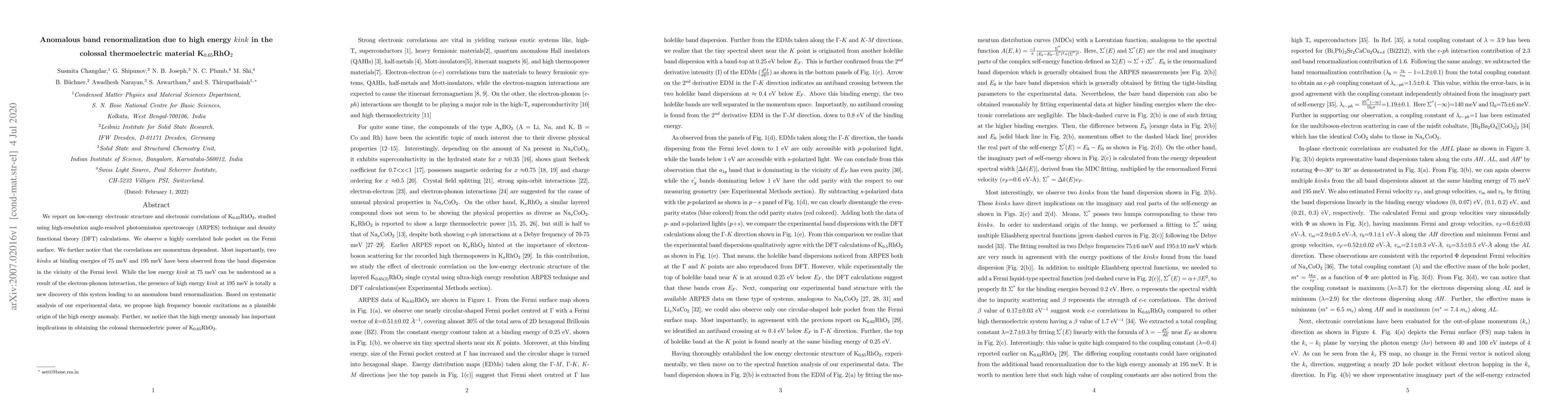 We report on low-energy electronic structure and electronic correlations of K$_{0.65}$RhO$_2$, studied using high-resolution angle-resolved photoemission spectroscopy (ARPES) technique and density functional theory (DFT) calculations. We observe a highly correlated hole pocket on the Fermi surface. We further notice that the correlations are momentum dependent. Most importantly, two $kinks$ at binding energies of 75 meV and 195 meV have been observed from the band dispersion in the vicinity of the Fermi level. While the low energy $kink$ at 75 meV can be understood as a result of the electron-phonon interaction, the presence of high energy $kink$ at 195 meV is totally a new discovery of this system leading to an anomalous band renormalization. Based on systematic analysis of our experimental data, we propose high frequency bosonic excitations as a plausible origin of the high energy anomaly. Further, we notice that the high energy anomaly has important implications in obtaining the colossal thermoelectric power of K$_{0.65}$RhO$_2$.