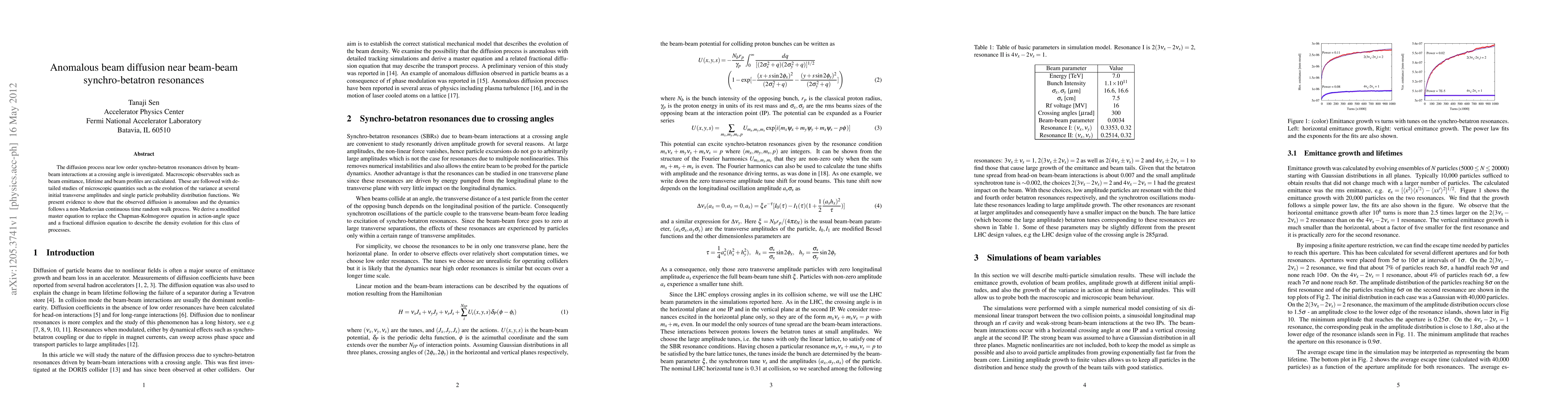 The diffusion process near low order synchro-betatron resonances driven by beam-beam interactions at a crossing angle is investigated. Macroscopic observables such as beam emittance, lifetime and beam profiles are calculated. These are followed with detailed studies of microscopic quantities such as the evolution of the variance at several initial transverse amplitudes and single particle probability distribution functions. We present evidence to show that the observed diffusion is anomalous and the dynamics follows a non-Markovian continuous time random walk process. We derive a modified master equation to replace the Chapman-Kolmogorov equation in action-angle space and a fractional diffusion equation to describe the density evolution for this class of processes.