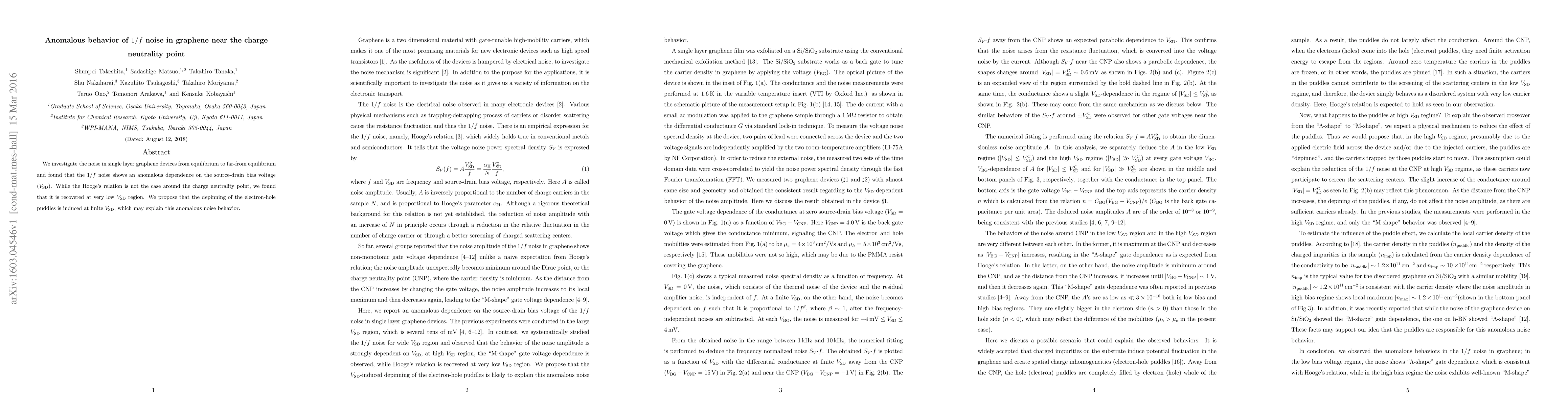 Summary: This study reveals anomalous 1/f noise behavior in graphene near the charge neutrality point, deviating from the Hooge relation, but returning to it at low biases. The researchers propose that electron-hole puddle depinning at finite biases explains this unusual noise characteristic.