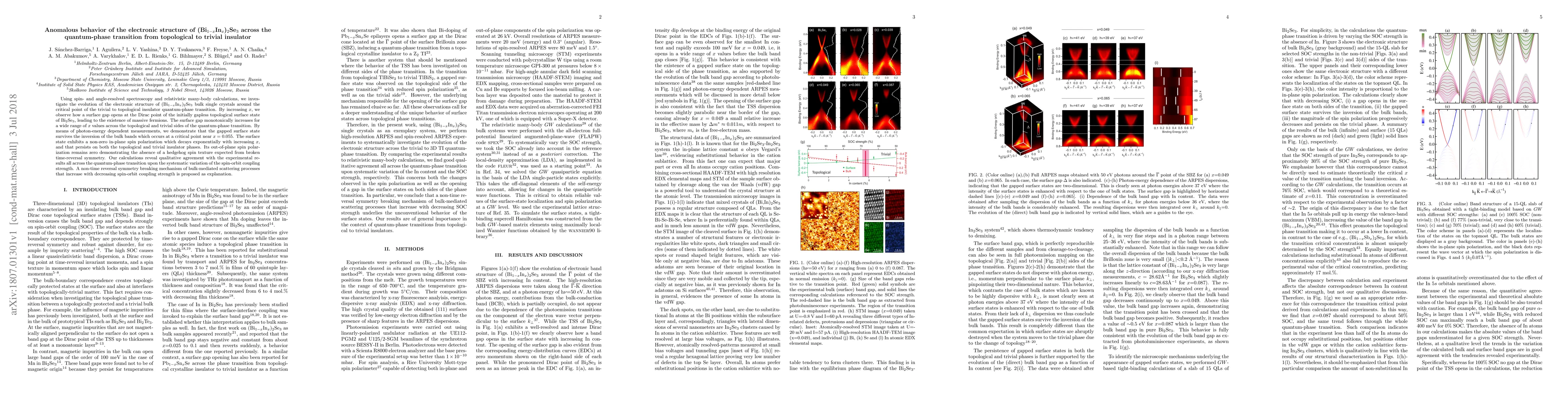 Researchers studied the electronic structure of Bi$_{1-x}$In$_x$)$_2$Se$_3$, a material that undergoes a quantum-phase transition from topological to trivial insulator. They found that as the material changes state, a surface gap opens at the Dirac point, leading to massive fermions and a non-zero in-plane spin polarization.