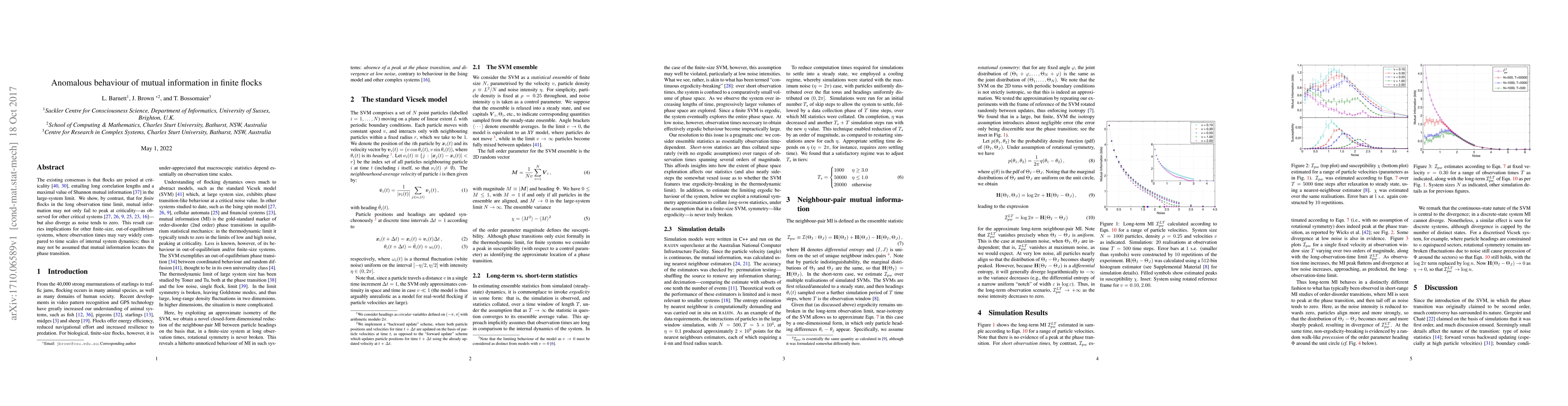 The existing consensus is that flocks are poised at criticality, entailing long correlation lengths and a maximal value of Shannon mutual information in the large-system limit. We show, by contrast, that for finite flocks in the long observation time limit, mutual information may not only fail to peak at criticality---as observed for other critical systems---but also diverge as noise tends to zero. This result carries implications for other finite-size, out-of-equilibrium systems, where observation times may vary widely compared to time scales of internal system dynamics; thus it may not be assumed that mutual information locates the phase transition.